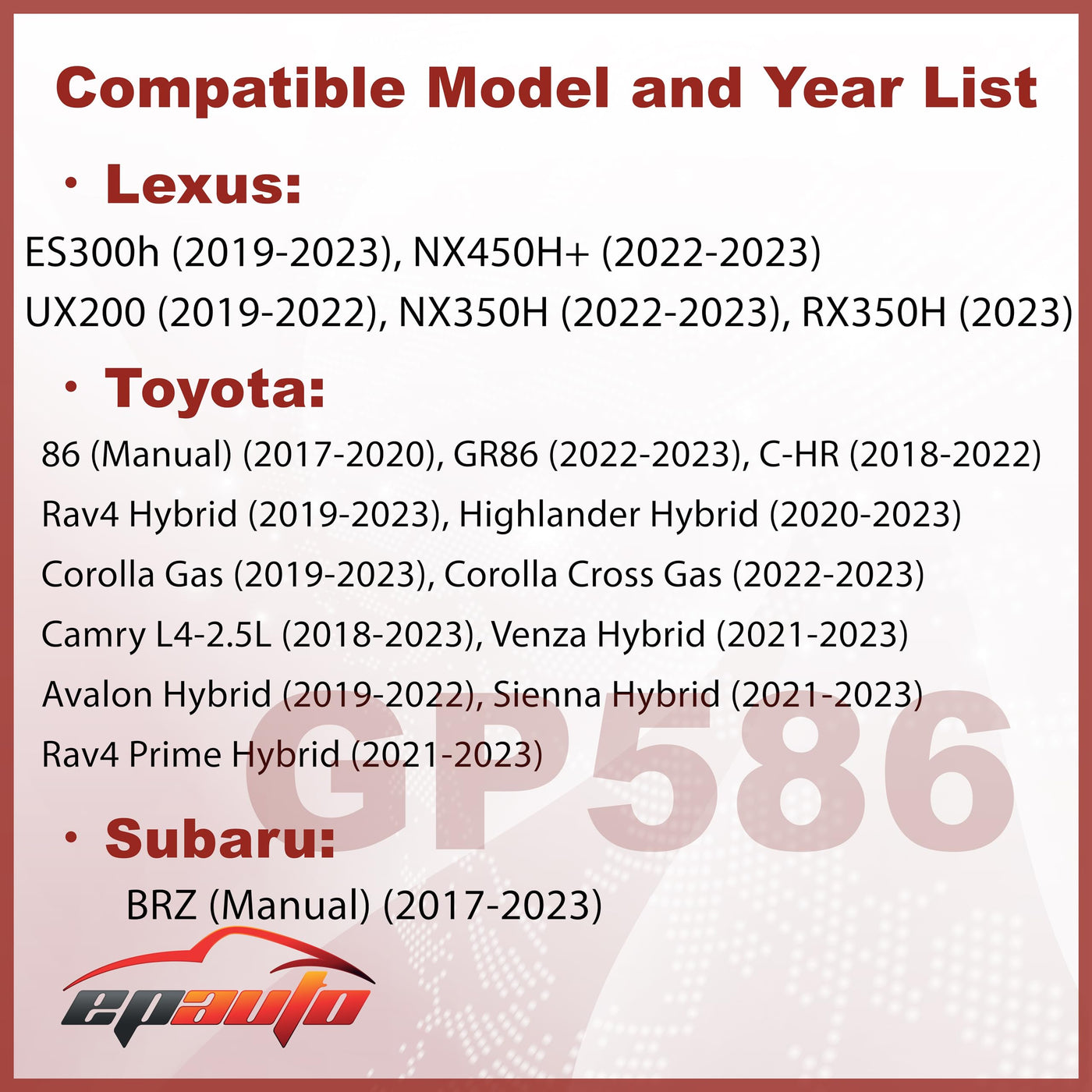 Q: What vehicles are compatible with the EPAuto GP586 Engine Air Filter?A: The EPAuto GP586 Engine Air Filter is compatible with various Toyota models, including the Camry Hybrid (2018-2023), Corolla (2019-2023), and Avalon Hybrid (2019-2022), as well as Lexus models such as the ES300h (2019-2023) and NX350H (2022-2023). It also fits certain Subaru models like the BRZ (2017-2023).