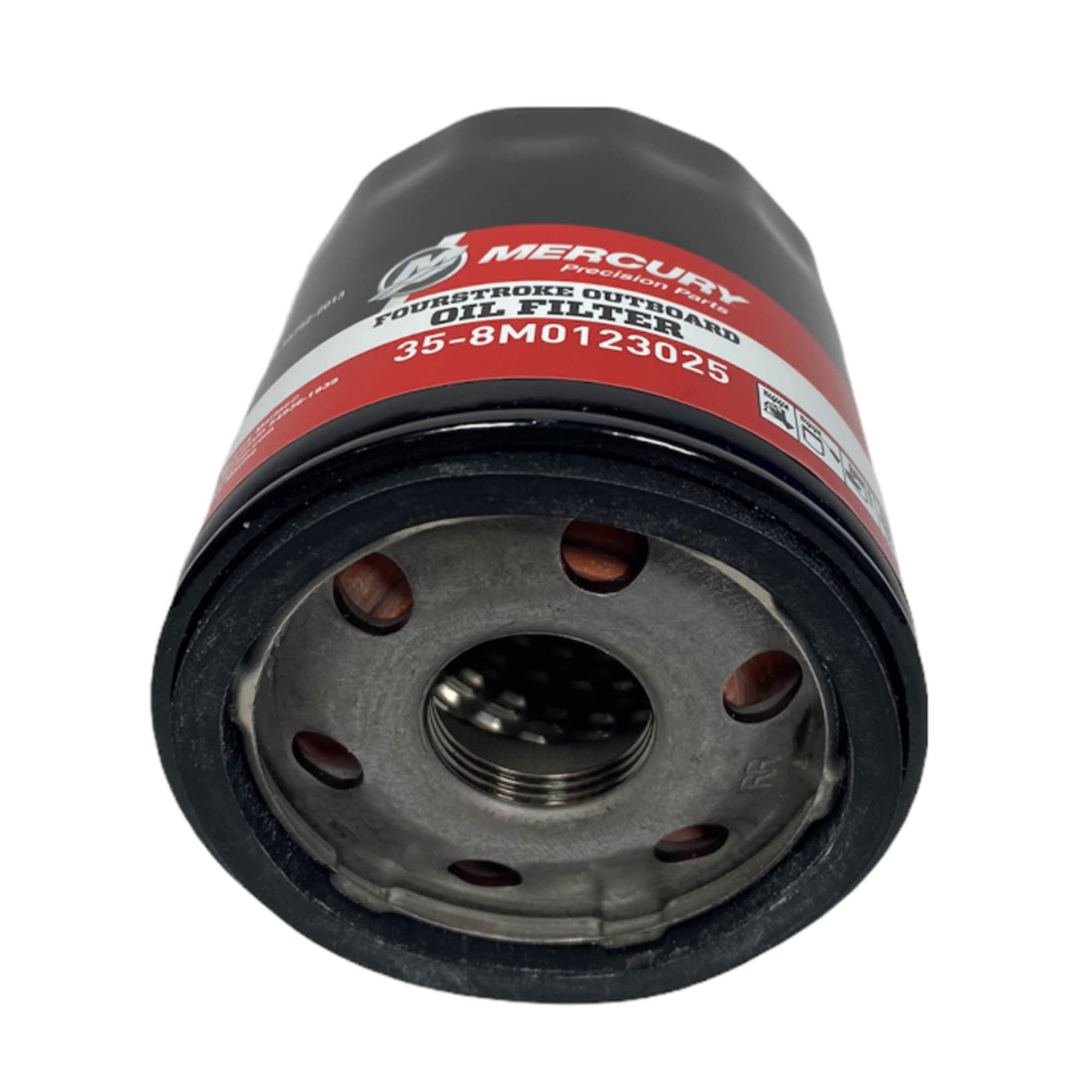 Q: What material is the Mercury Marine oil filter made of?A: The oil filter is constructed from high-quality metal, providing durability and reliability under various operating conditions.