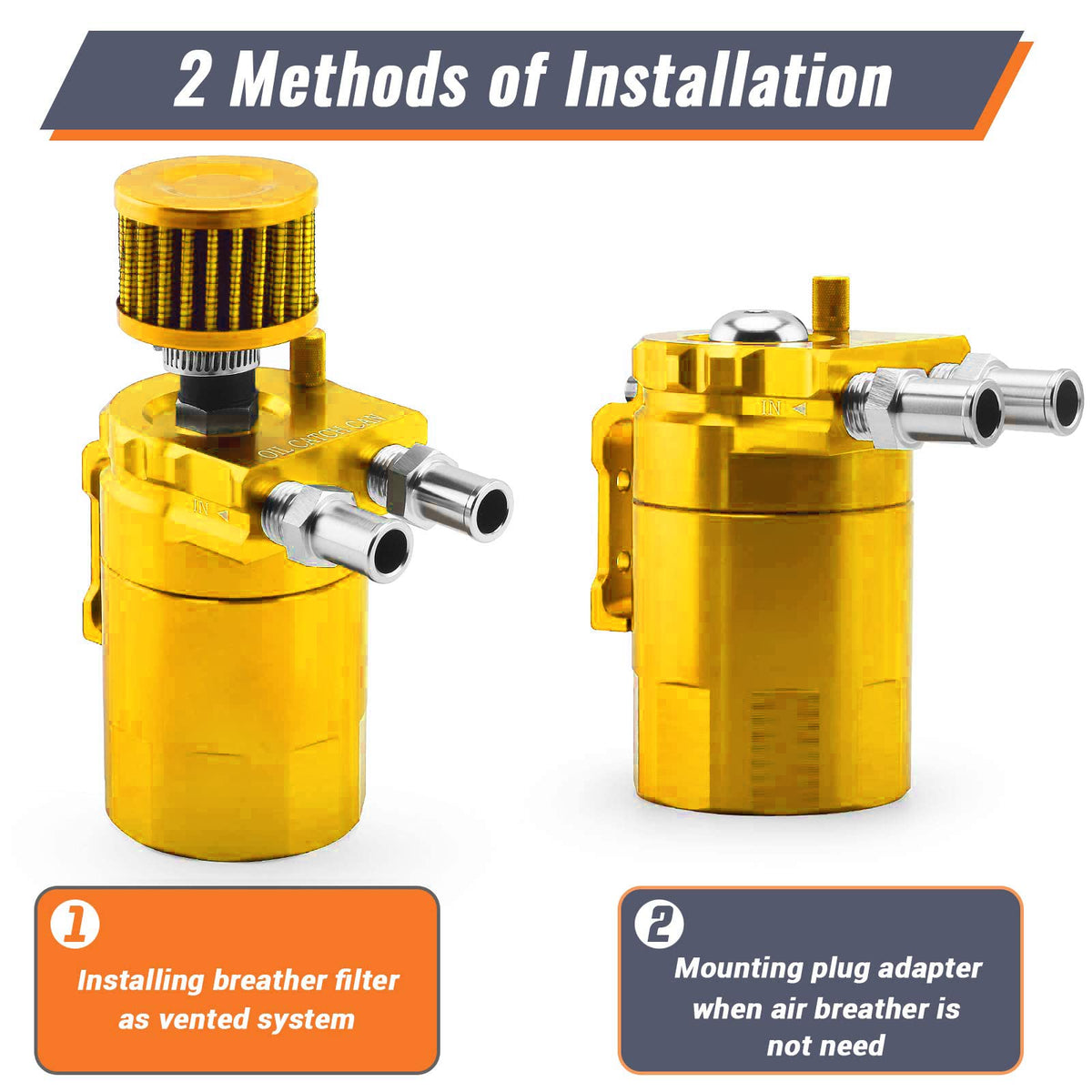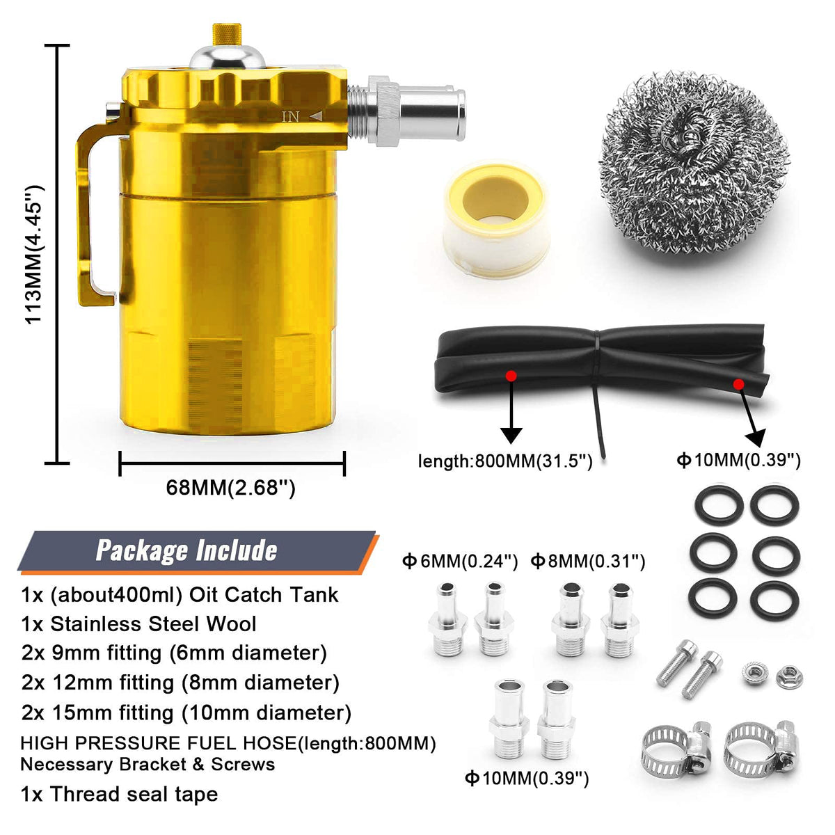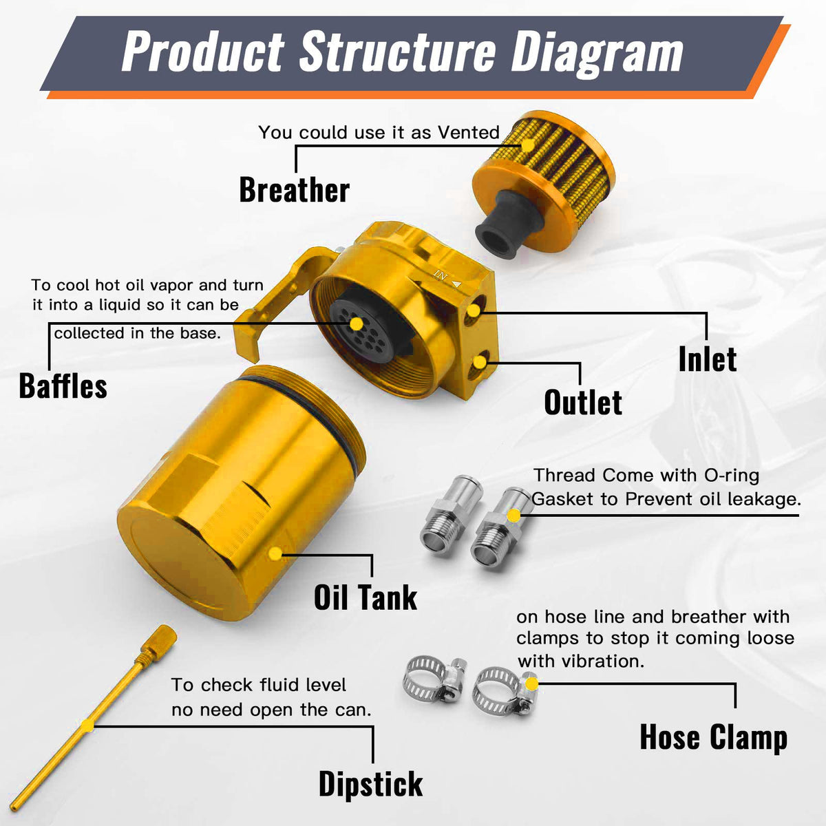 Universal Oil Catch Can with Breather Filter Kit The oil mist and other byproducts precipitate in the engine's intake, forming a sticky substance over time. The oil recovery tank collects the oil mist, condenses the fuel vapor,at the same time allow cleaner gas to return to the inlet. Material:Light-Weight Aluminum Volume:400ML Color: Gold Package Included:1x Oil Catch Tank Kit(As the picture) Installation: 1.Move away the engine cover. 2.Take the pipe away and put aside. 3.Wrap the anti -skid tape on the thread part of screws. 4.Put the screw on the oil catch tank. 5.Use your own nuts&bolts to hold the bracket to the unit. 6.Move out of the screw here,and then put the oil catch tank on the position with the same screw. 7.Take a new hose and cut a suitable length you think. 8.Put clamps on the two ens of the pipe and hose.