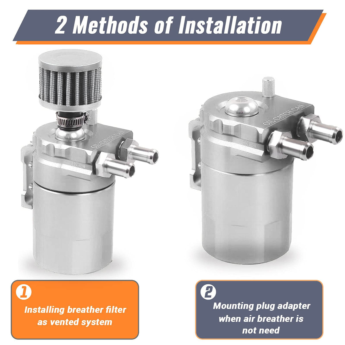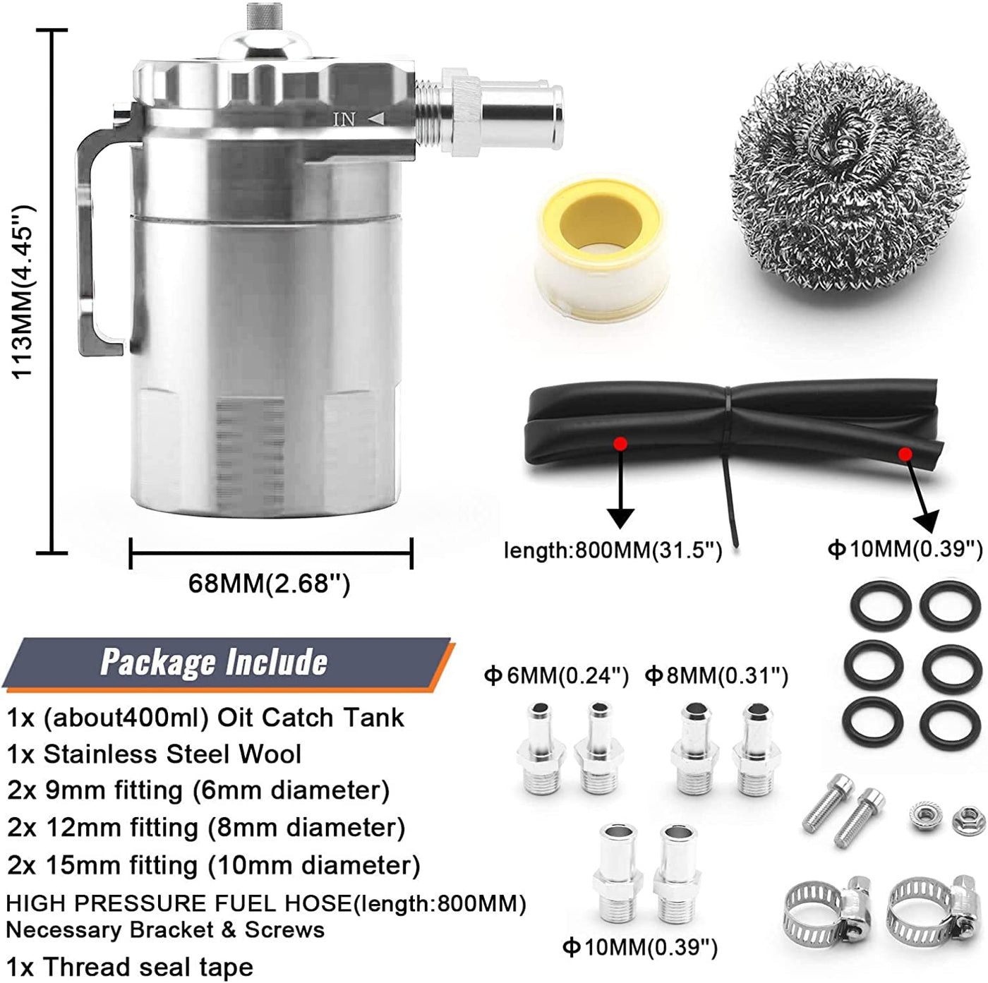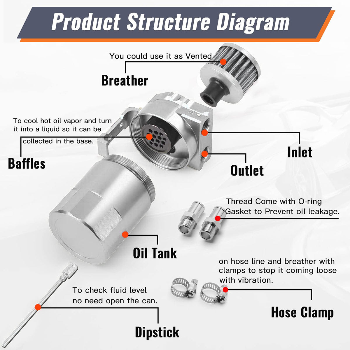 Universal Oil Catch Can with Breather Filter Kit The oil mist and other byproducts precipitate in the engine's intake, forming a sticky substance over time. The oil recovery tank collects the oil mist, condenses the fuel vapor,at the same time allow cleaner gas to return to the inlet. Material:Light-Weight Aluminum Volume:400ML Color: Silver Package Included:1x Oil Catch Tank Kit(As the picture) Installation: 1.Move away the engine cover. 2.Take the pipe away and put aside. 3.Wrap the anti -skid tape on the thread part of screws. 4.Put the screw on the oil catch tank. 5.Use your own nuts&bolts to hold the bracket to the unit. 6.Move out of the screw here,and then put the oil catch tank on the position with the same screw. 7.Take a new hose and cut a suitable length you think. 8.Put clamps on the two ens of the pipe and hose.