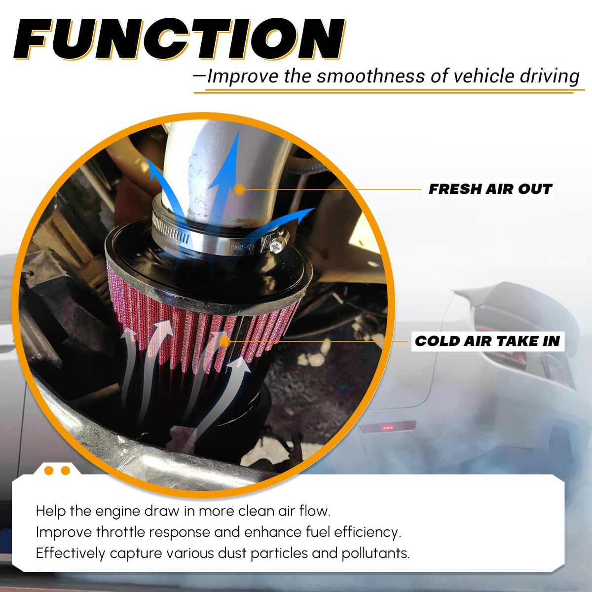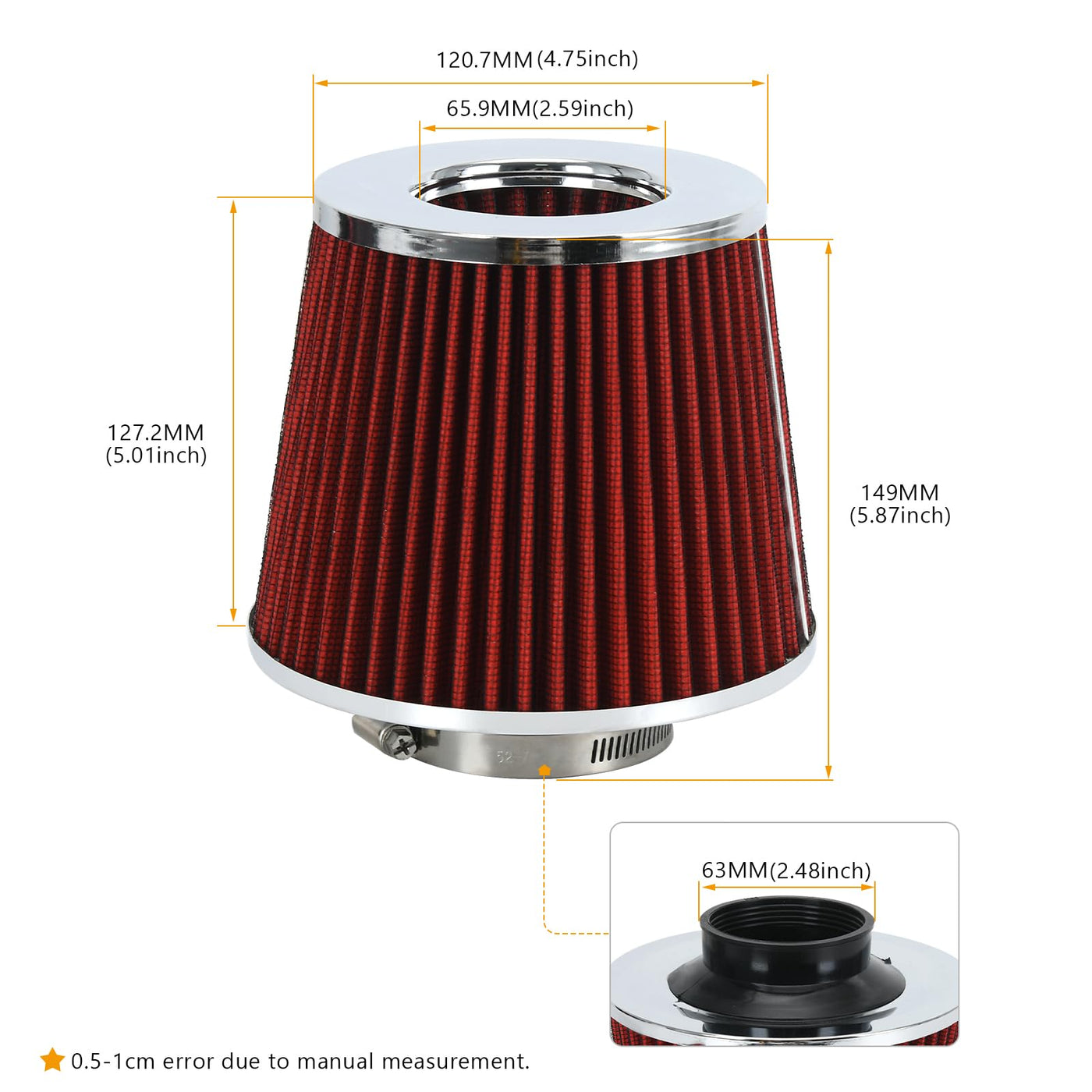 'Application: Universal fit for most car, auto, truck etc... Fit for any 63mm/2.5inch air intake hose, air intake systems on modified vehicles. Specification: Enhanced Airflow: The conical cold air intake filter provides an increased surface area, ensuring that your engine eceives the maximum amount of clean air for better airflow. Effective Filtration Media: It can efficiently trap a broad range of dust particles and contaminants, ensuring the air entering your engine clean, contributing to engine longevity and fuel efficiency. Washable: Our air filters are made of durable materials that can be easily cleaned and reused multiple times, helping to reduce replacement waste. Easy To Install: The simple clamp-on design allows for direct replacement of aging filters, saving time and money. At PTNHZ, if you have any question about our product, please contact us right away, we can handle any problems.