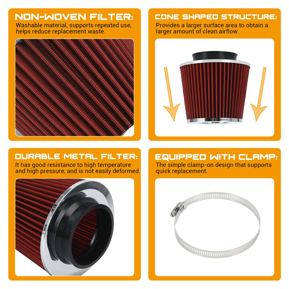 Application: Universal fit for most car, auto, truck etc... Fit for any 89mm/3.5inch air intake hose, air intake systems on modified vehicles. Specification: Enhanced Airflow: The conical cold air intake filter provides an increased surface area, ensuring that your engine receives the maximum amount of clean air for better airflow. Effective Filtration Media: It can efficiently trap a broad range of dust particles and contaminants, ensuring the air entering your engine clean, contributing to engine longevity and fuel efficiency. Washable: Our air filters are made of durable materials that can be easily cleaned and reused multiple times, helping to reduce replacement waste. Easy To Install: The simple clamp-on design allows for direct replacement of aging filters, saving time and money. At PTNHZ, if you have any question about our product, please contact us right away, we can handle any problems.