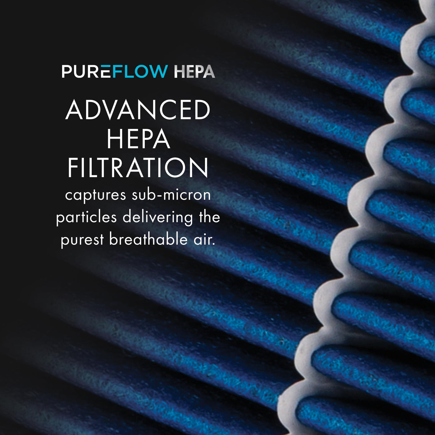 BREATHE BETTER AIR. PUREFLOW HEPA by Premium Guard cleans with 4 filtration levels. For drivers and passengers who suffer from severe allergies, PUREFLOW HEPA (High Efficiency Particulate Air) offers 99.97% efficiency, capturing microscopic pollutants including pollen and other allergens (may result in a minor restriction to airflow). | FRESHENS AND CONDITIONS YOUR CABIN AIR. Activated charcoal can trap gases like carbon monoxide and sulfur dioxide. This layer is also infused with baking soda to absorb bad odors. | ADVANCED FILTRATION TECHNOLOGY. PUREFLOW