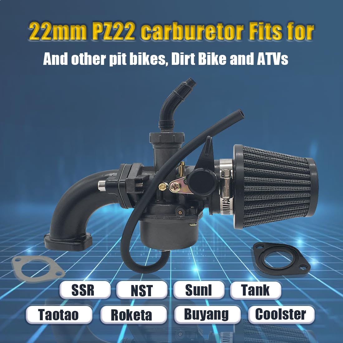 Q: What type of bikes is the PZ22 Carburetor Air Filter Kit compatible with?A: The PZ22 Carburetor Air Filter Kit is compatible with various 4-stroke dirt bikes, including models from Kazuma, SunL, TAOTAO, NST, Coolster, and others. It fits 70cc, 110cc, and 125cc models, making it ideal for pit bikes, dirt bikes, ATVs, and quads.