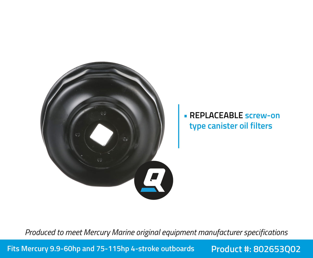 Q: What types of oil filters is the Quicksilver 802653Q02 wrench compatible with?A: The Quicksilver 802653Q02 Oil Filter Wrench is designed to fit replaceable screw-on type canister oil filters found on Mercury/Mariner FourStroke outboards, specifically models ranging from 9.9 to 60hp, and the 75-115hp models with specific serial numbers.