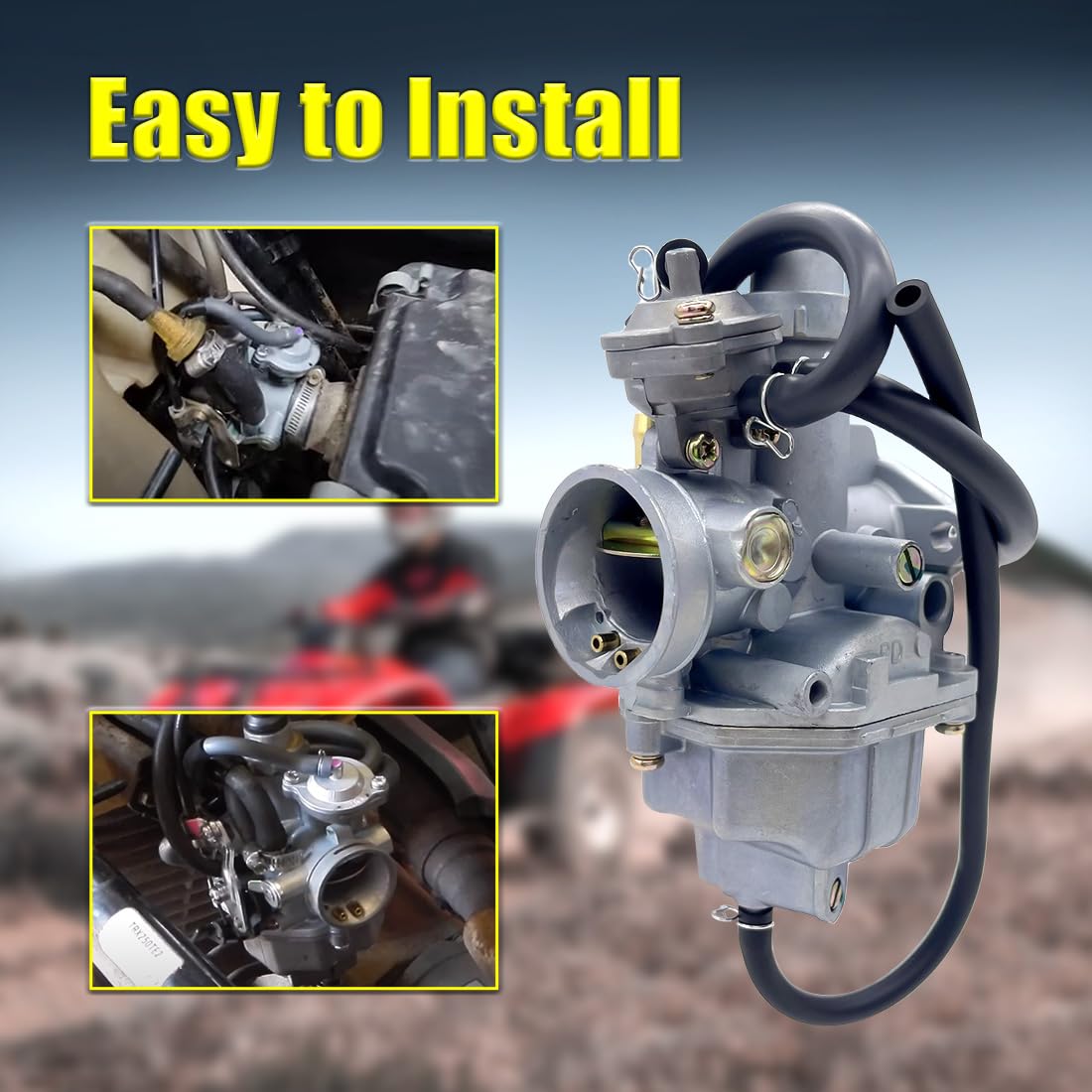 Q: How do I install the carburetor and fuel valve petcock?A: To install the carburetor and fuel valve petcock, first ensure your ATV is off and cool. Remove the old carburetor and petcock, then connect the new carburetor and petcock according to your model's service manual. Ensure all connections are secure and test for leaks before starting the engine.