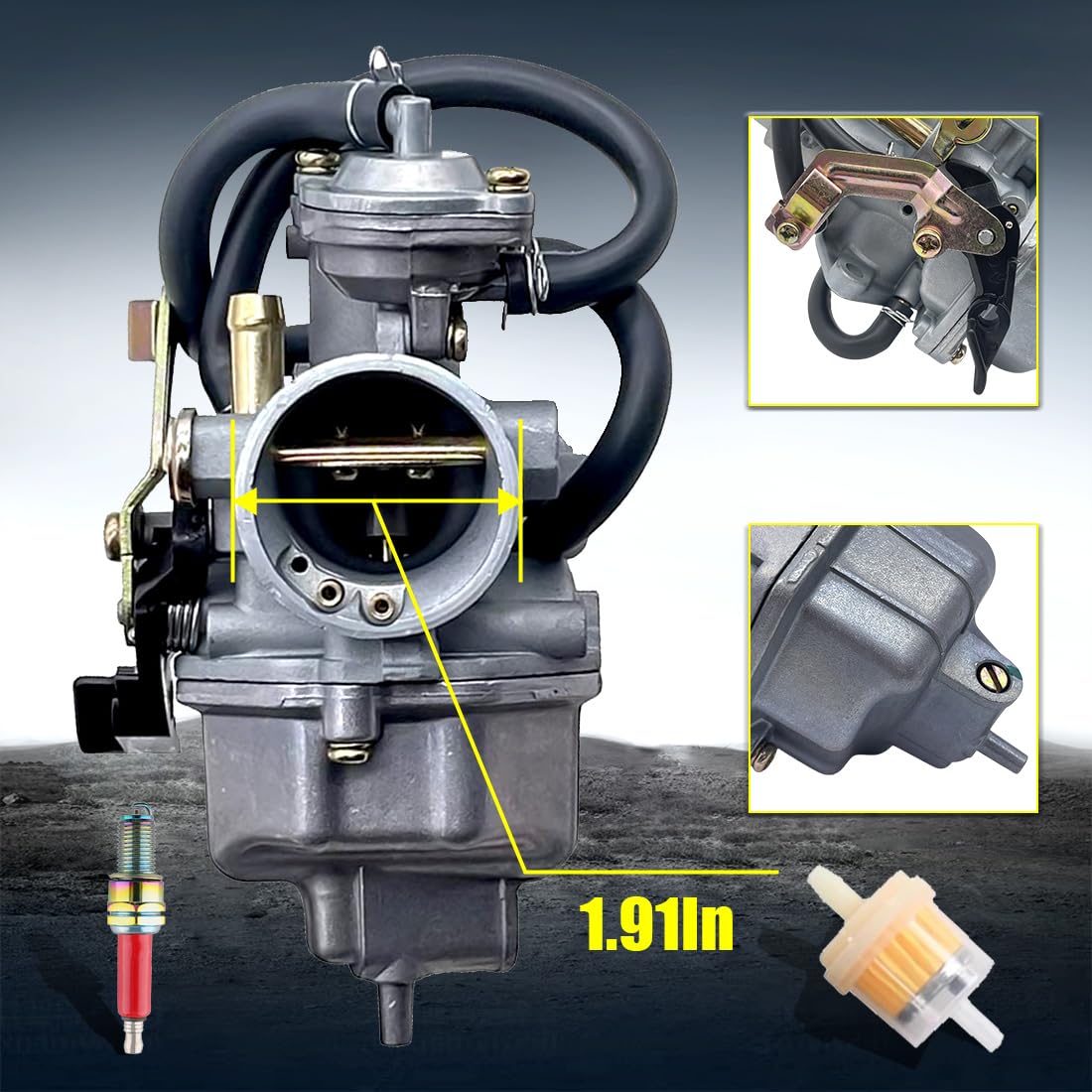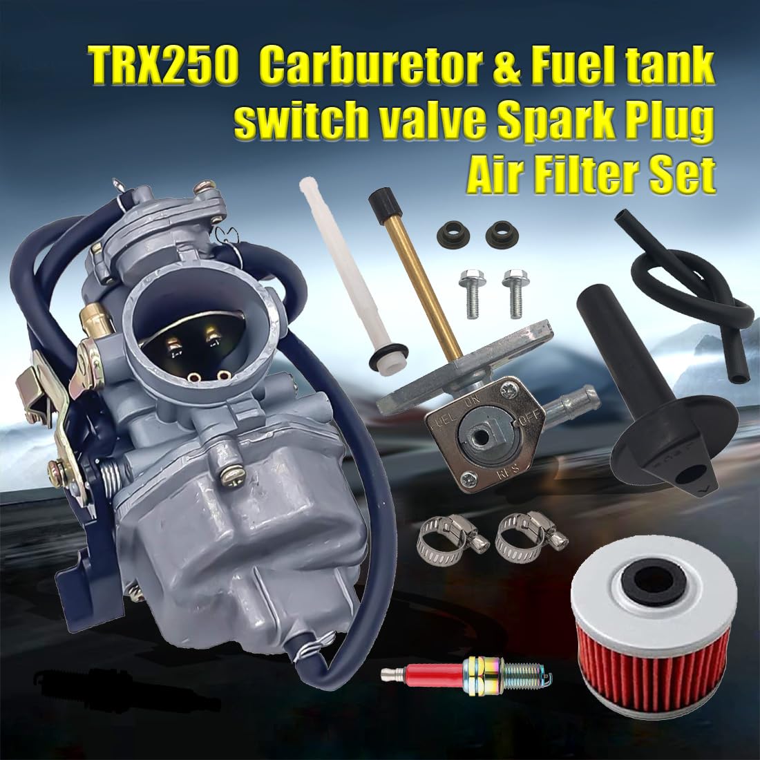 Carburetor & Fuel Valve Petcock with Lever Screw Fit for Honda TRX250 TRX250TE TRX250TM Recon with Air Filter Oil Filter Spark Plug Set Carburetor with Air Filter Oil Filter Spark Plug Set Fit for 1997-2000 TRX250 Carburetor with Spark Plug Fit for 2002-2007 TRX250TE FOURTRAX RECON ES Carburetor with Spark Plug Fit for 2002-2007 TRX250TM FOURTRAX RECON (Note : This carburetor doesn't fit for Honda TRX250 Recon 2001.) Carburetor Replace Part Number :16100-hm8-b01 Air Filter Replace Part Number :17254-HM8-000 Fuel valve petcock replace Number :16950-HN7-003, 16950-HM8-003, 16950-HP5-601 16950-HM7-003, 16950-HN2-003, 16950-HP0-A01 Package included : 1x TRX 250 Carburetor 1 x Oil Filter 1 x Spark Plug 1 x TRX 250 Air Filter 1 x Fuel Valve Petcock 1 x Lever Screw 1 x Fuel Lines 2 x Adjustable Screw