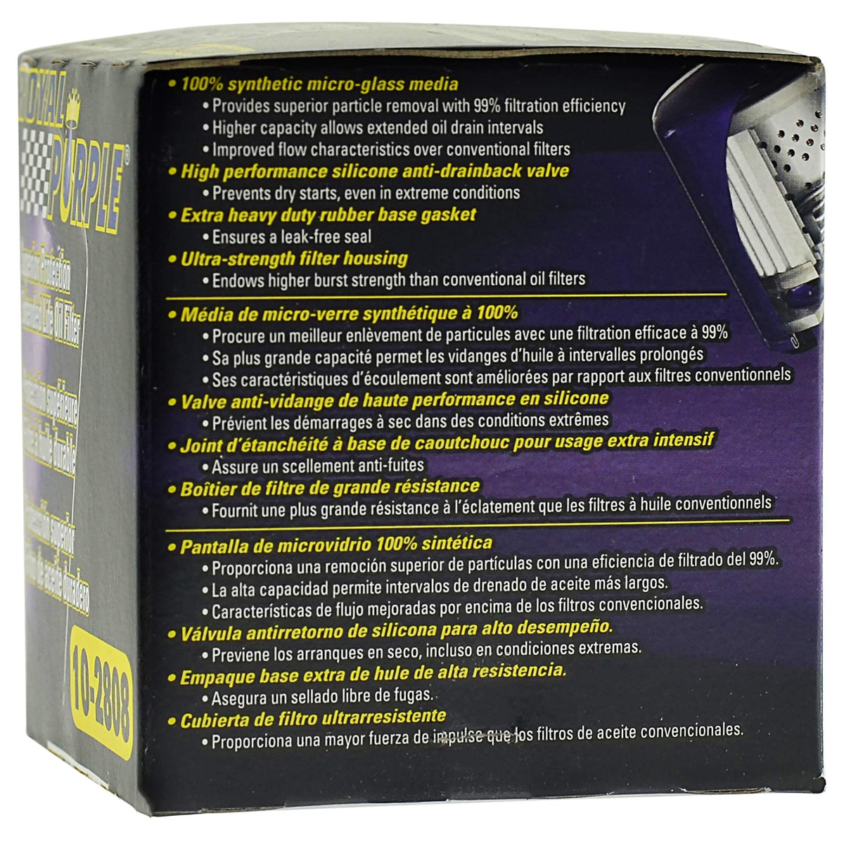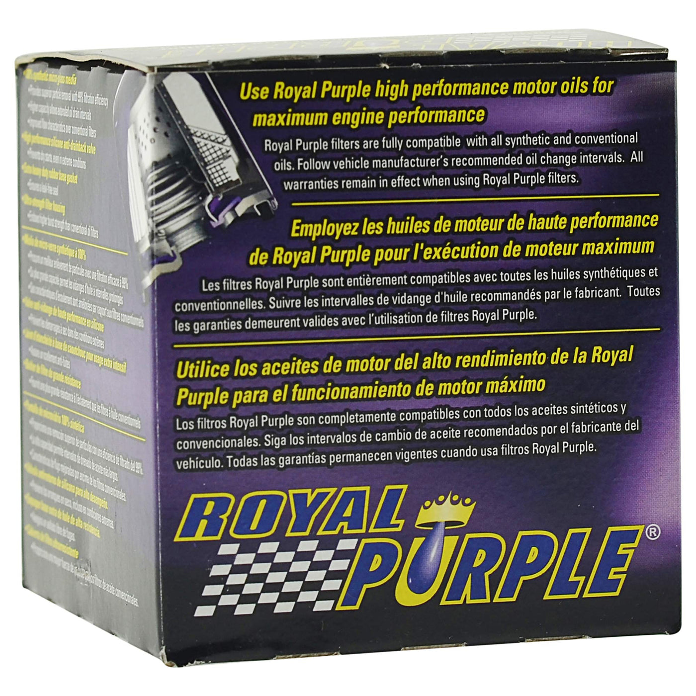 Royal Purple Oil Filter Features 100 Percentage Synthetic Micro-Glass Media For Superior Particle Removal With 99 Percentage Filtration Efficiency At 25 Microns. This Product Is Designed With A High-Performance Silicone Anti-Drain Back Valve That Prevents Dry Starts, Even In Extreme Conditions And An Extra Heavy-Duty Rubber Base Gasket That Ensures A Leak-Free Seal. The Royal Purple Oil Filter Also Provides An Ultra-Strength Filter Housing That Can Endure Higher Burst Strength Than Conventional Filters. Royal Purple Filters Are Fully Compatible With All Synthetic And Conventional Oils, Provide Superior Particle Removal, High-Performance, Optimized Flow Characteristics For Maximum Performance, And Longer Filter Life.