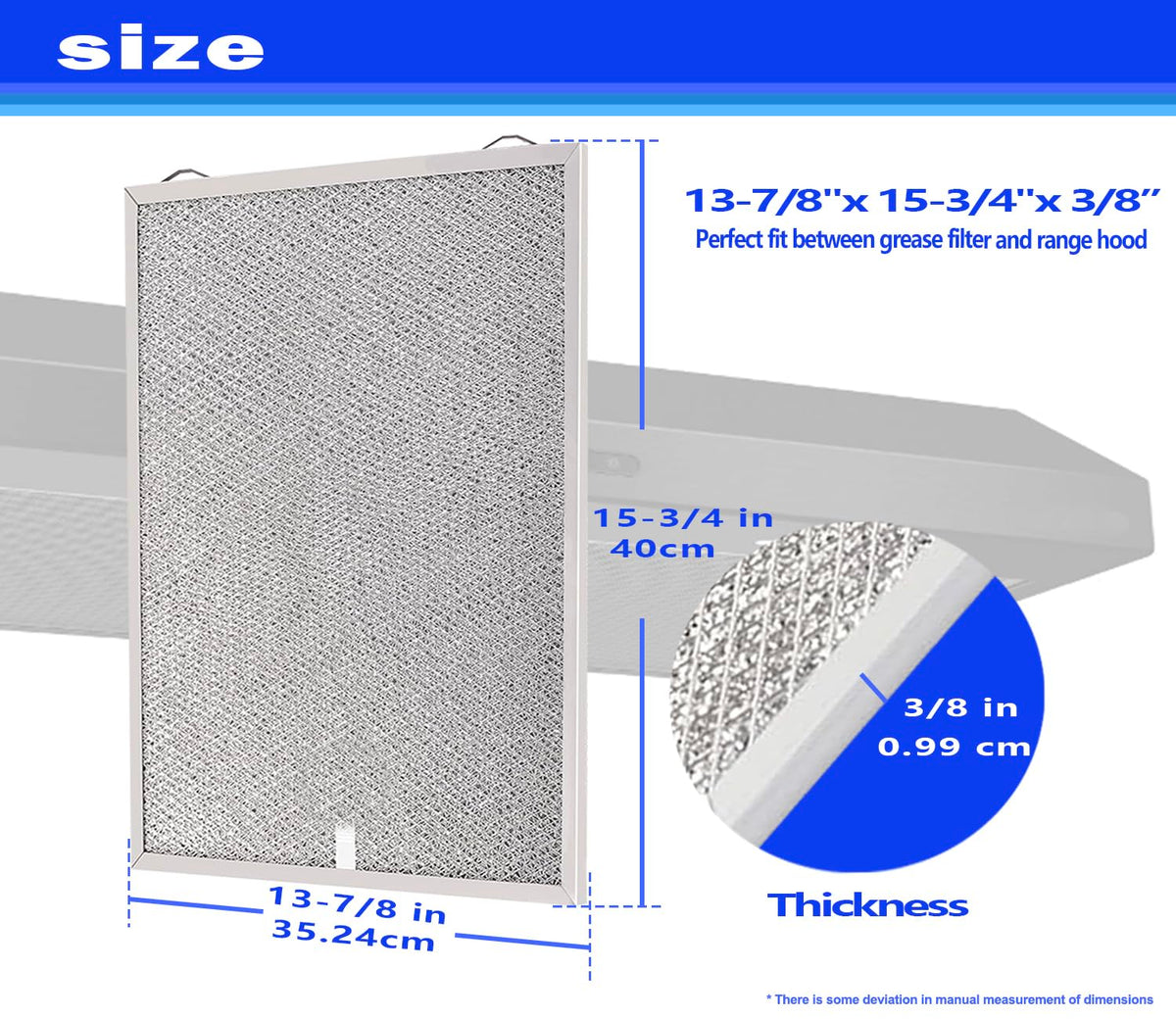 Q: What are the dimensions of the S99010430-002 Range Hood Filter?A: The S99010430-002 Range Hood Filter measures 13.75 inches by 15.88 inches and has a thickness of 0.3 inches.