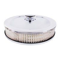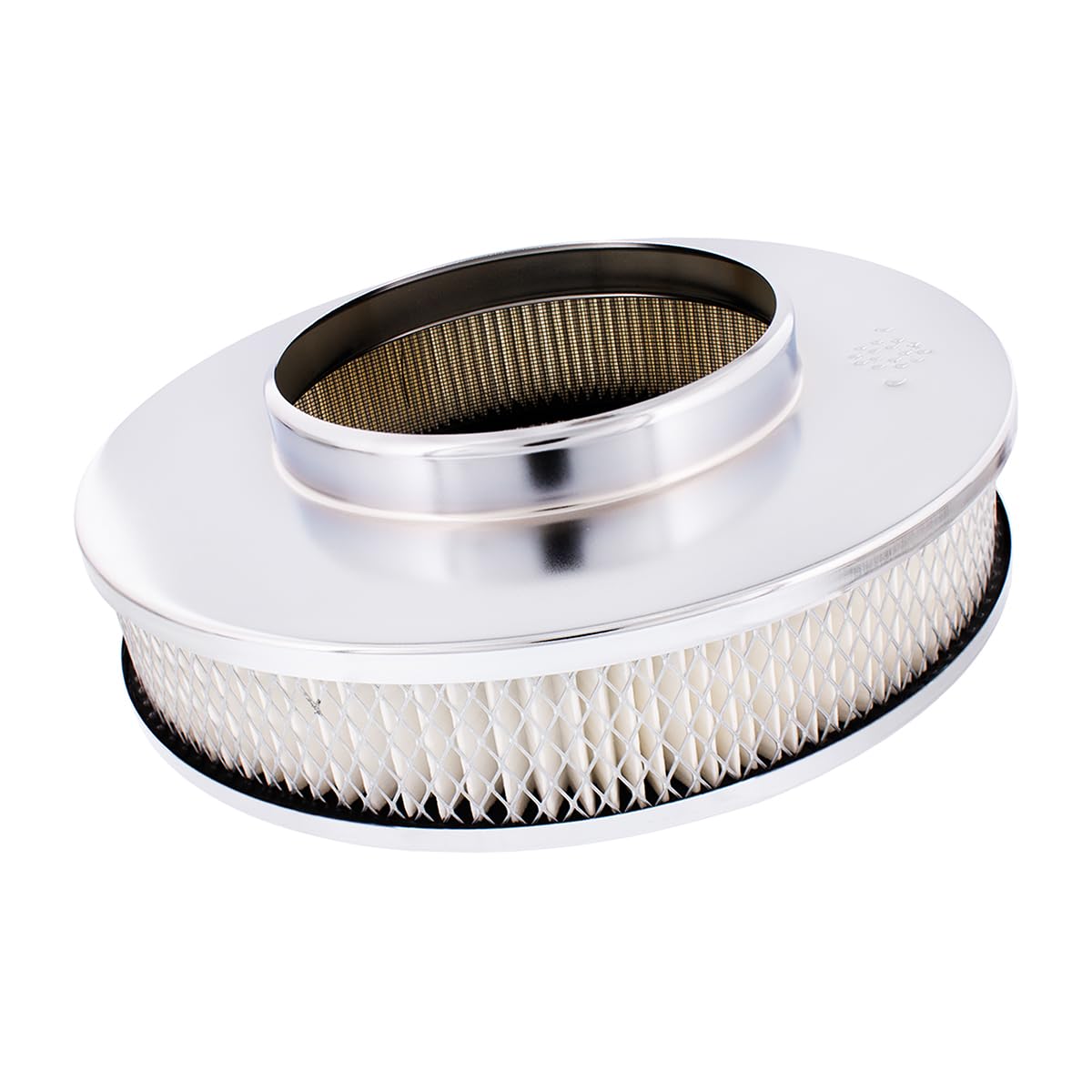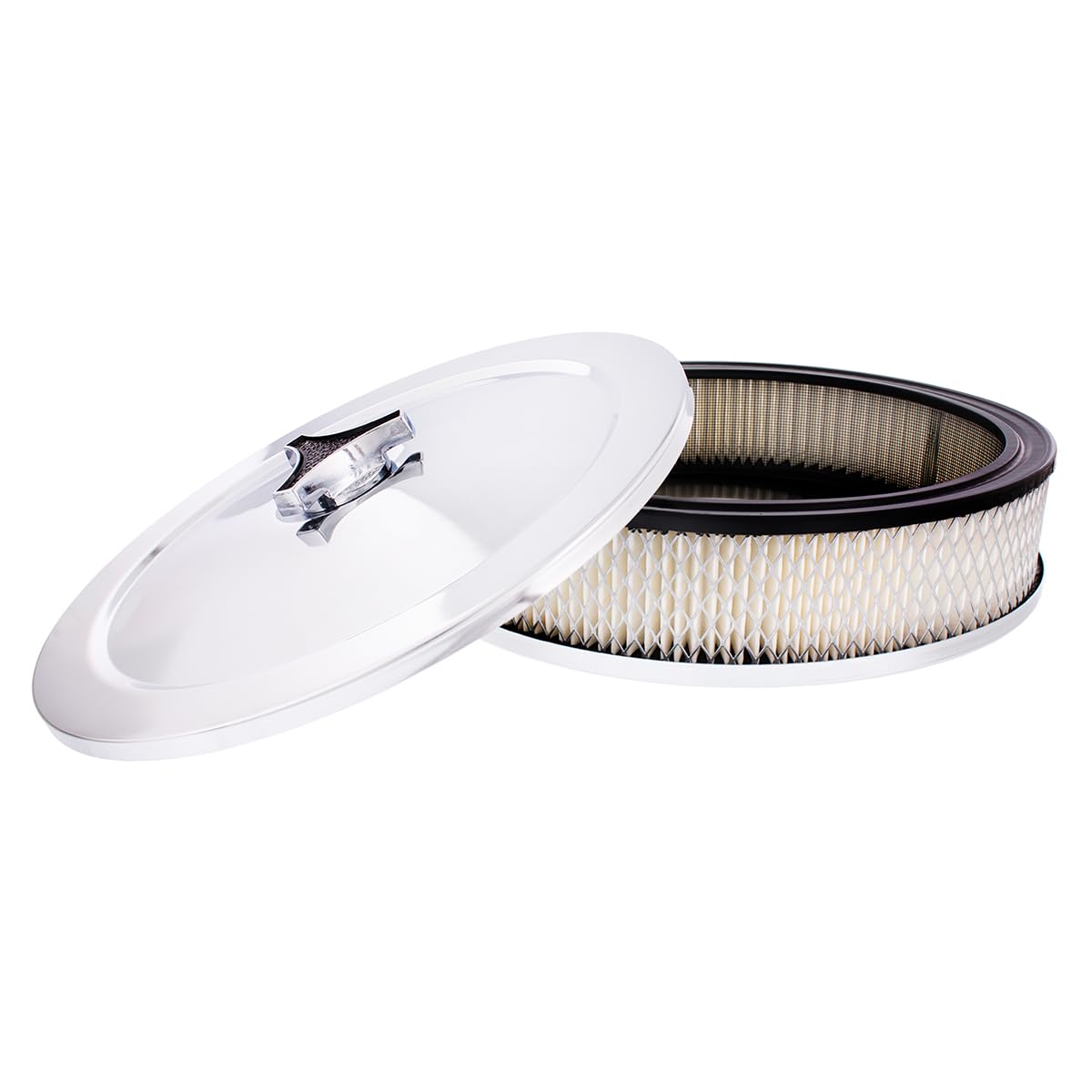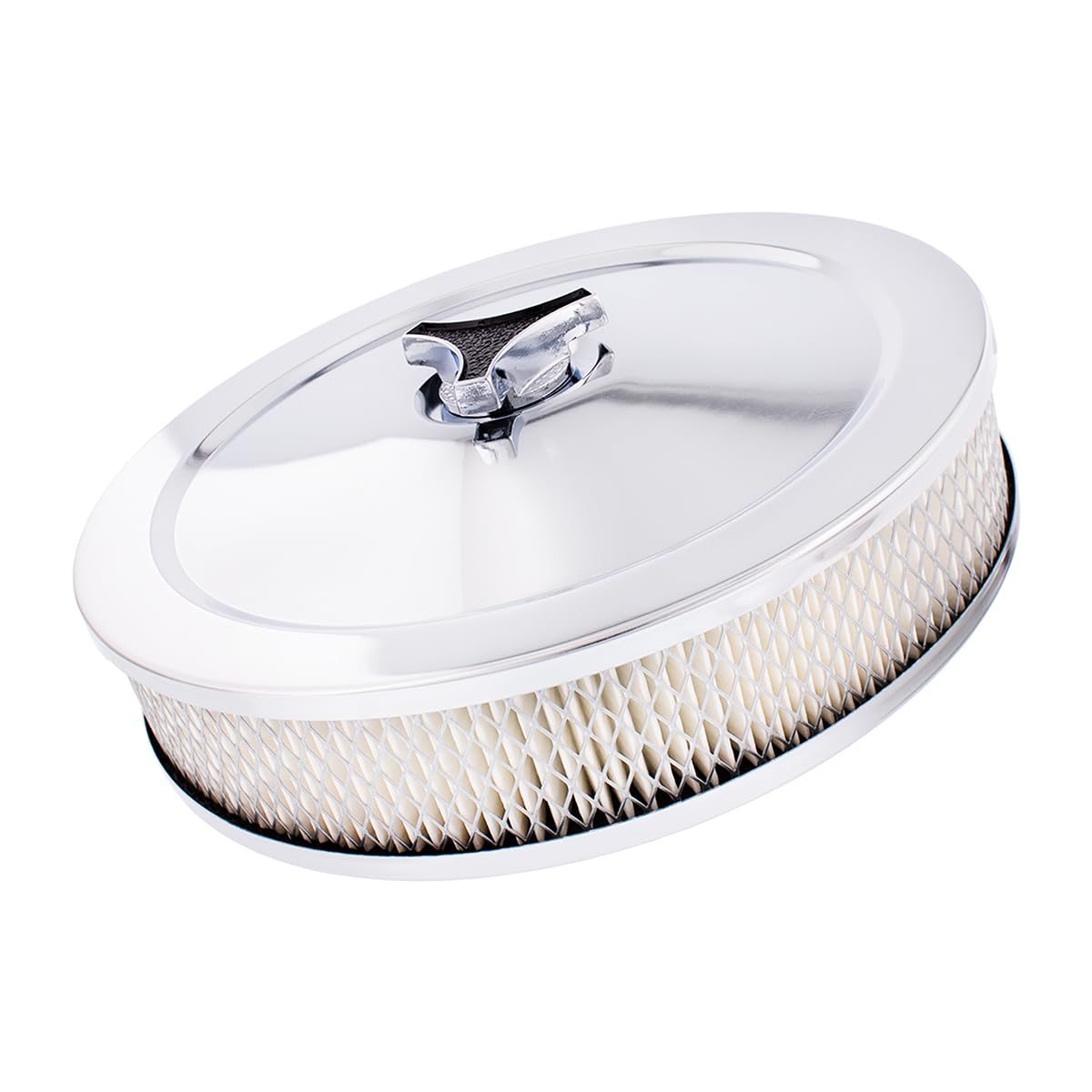 Q: What is included in the United Pacific 10-inch Chrome Air Cleaner Assembly?A: The United Pacific 10-inch Chrome Air Cleaner Assembly includes a complete air cleaner assembly, which features a low profile design, a die-cast chrome plated 3-wing nut, a filter, and a PVC breather hose. This set is perfect for enhancing the performance and appearance of your 4-barrel carburetor setup.