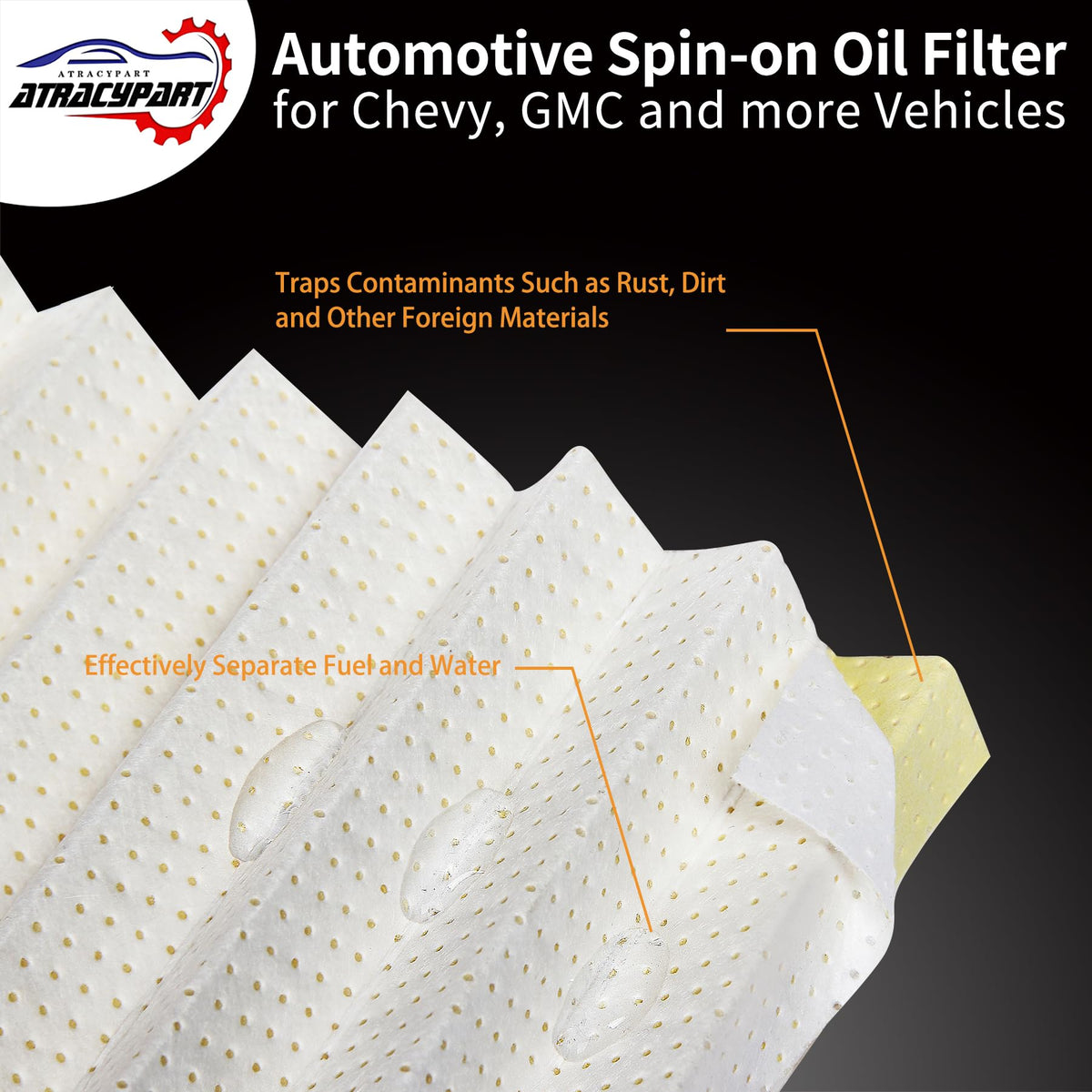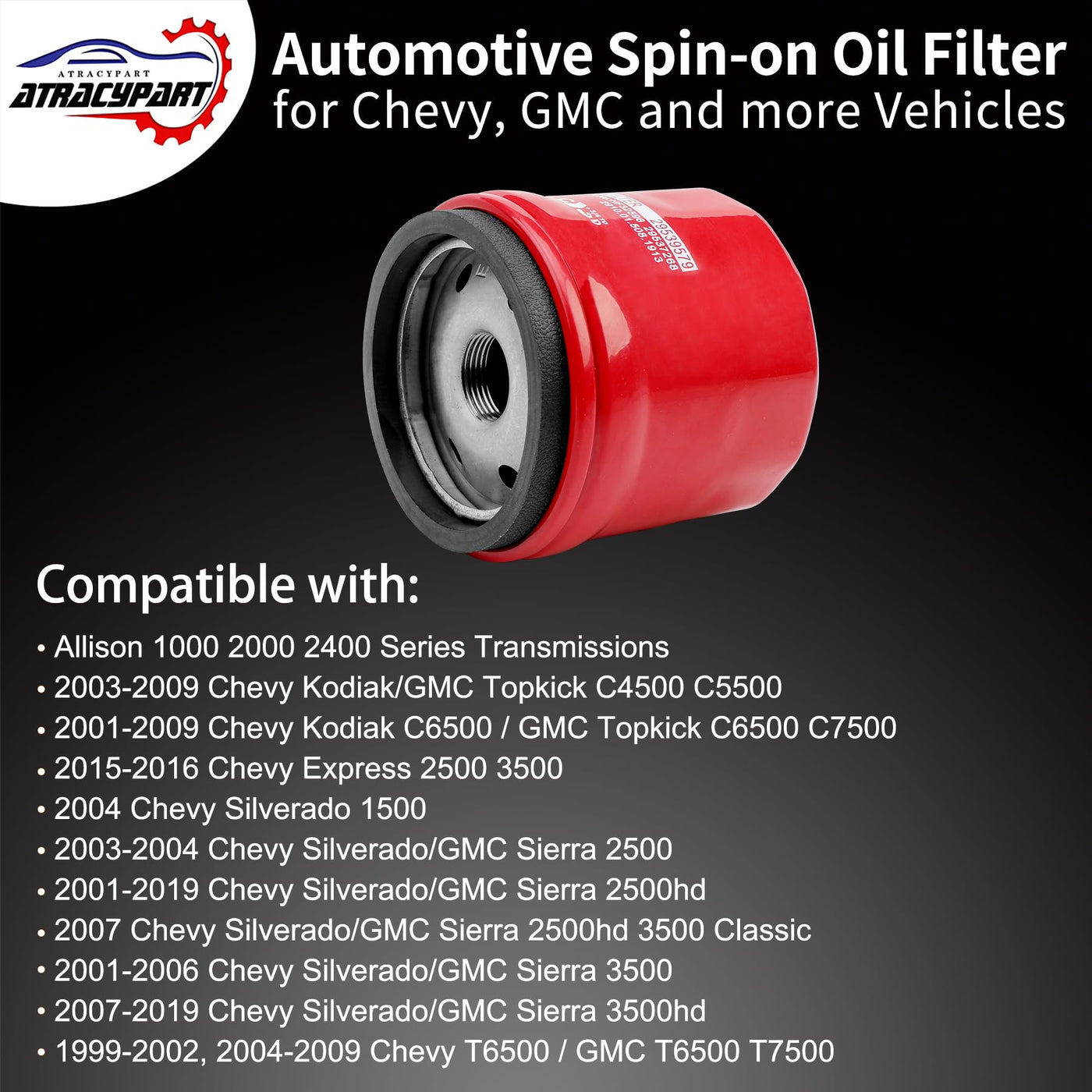 Quality oil filter plays an important role in an engine as it avoids damages caused by dirt particles, soot or unburned fuel in the oil. The component allows just the circulation of fresh oil into the engine and it keeps the dirt. This is why the oil filter needs to be treated or changed within some period of time. Compatible With: ALLISON 1000 2000 2400 SERIES TRANSMISSIONS2003-2009 CHEVY C4500 C5500 KODIAK2001-2009 CHEVY C6500 KODIAK2015-2016 CHEVY EXPRESS 2500 35002004 CHEVY SILVERADO 15002003-2004 CHEVY SILVERADO 25002001-2019 CHEVY SILVERADO 2500HD2007 CHEVY SILVERADO 2500HD 3500 CLASSIC2001-2006 CHEVY SILVERADO 35002007-2019 CHEVY SILVERADO 3500HD1999-2002, 2004-2009 CHEVY T65002003-2009 GMC C4500 C5500 TOPKICK2001-2009 GMC C6500 C7500 TOPKICK2003-2004 GMC SIERRA 25002001-2019 GMC SIERRA 2500HD2007 GMC SIERRA 2500HD 3500 CLASSIC2001-2006 GMC SIERRA 35002007-2019 GMC SIERRA 3500HD1998-2002, 2004-2009 GMC T6500 T7500Replaces Part Numbers:29539579
