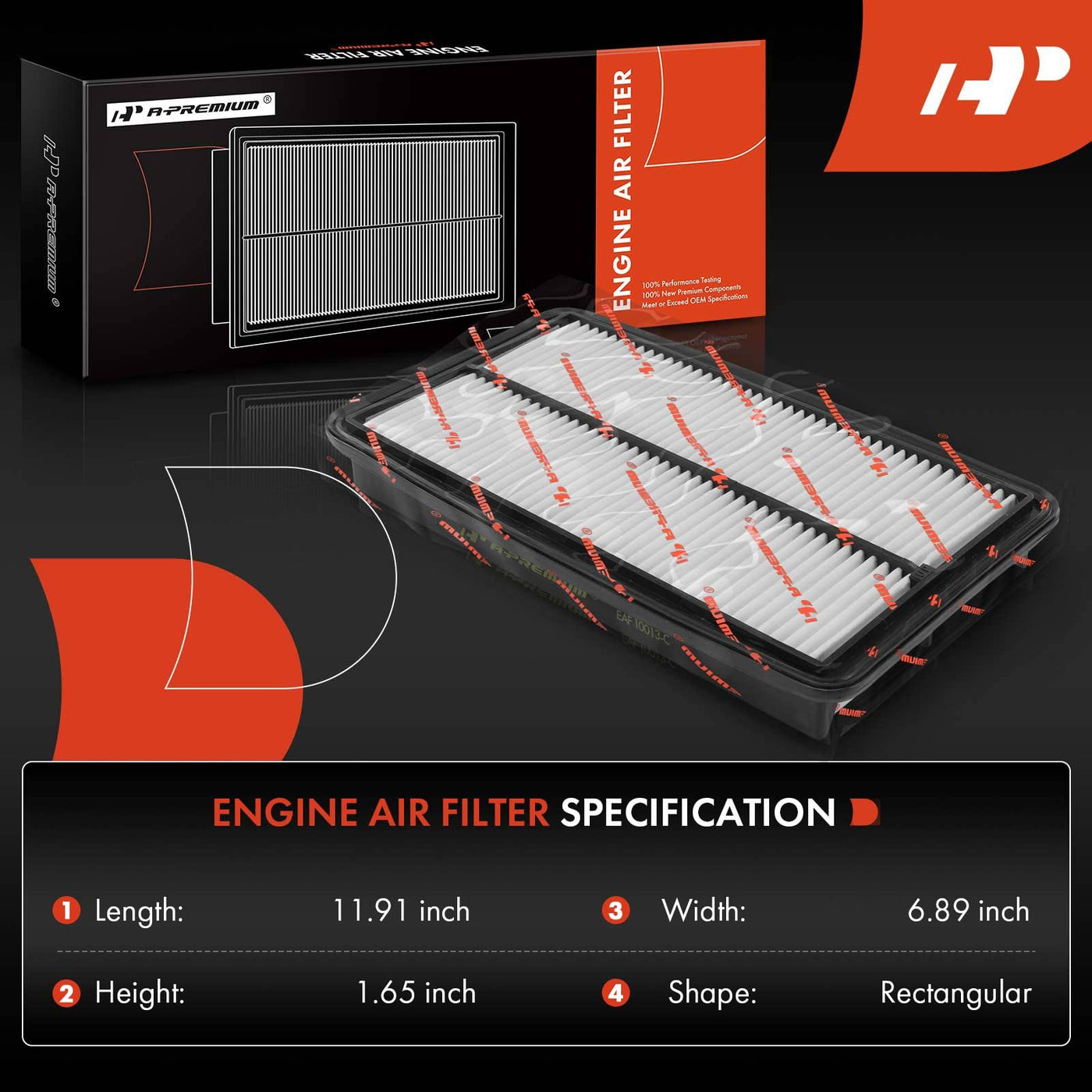 Q: What are the dimensions of the A-Premium Engine Air Filter?A: The dimensions of the A-Premium Engine Air Filter are as follows: Length - 11.91 inches (302.5 mm), Width - 6.89 inches (175 mm), and Height - 1.65 inches (42 mm).