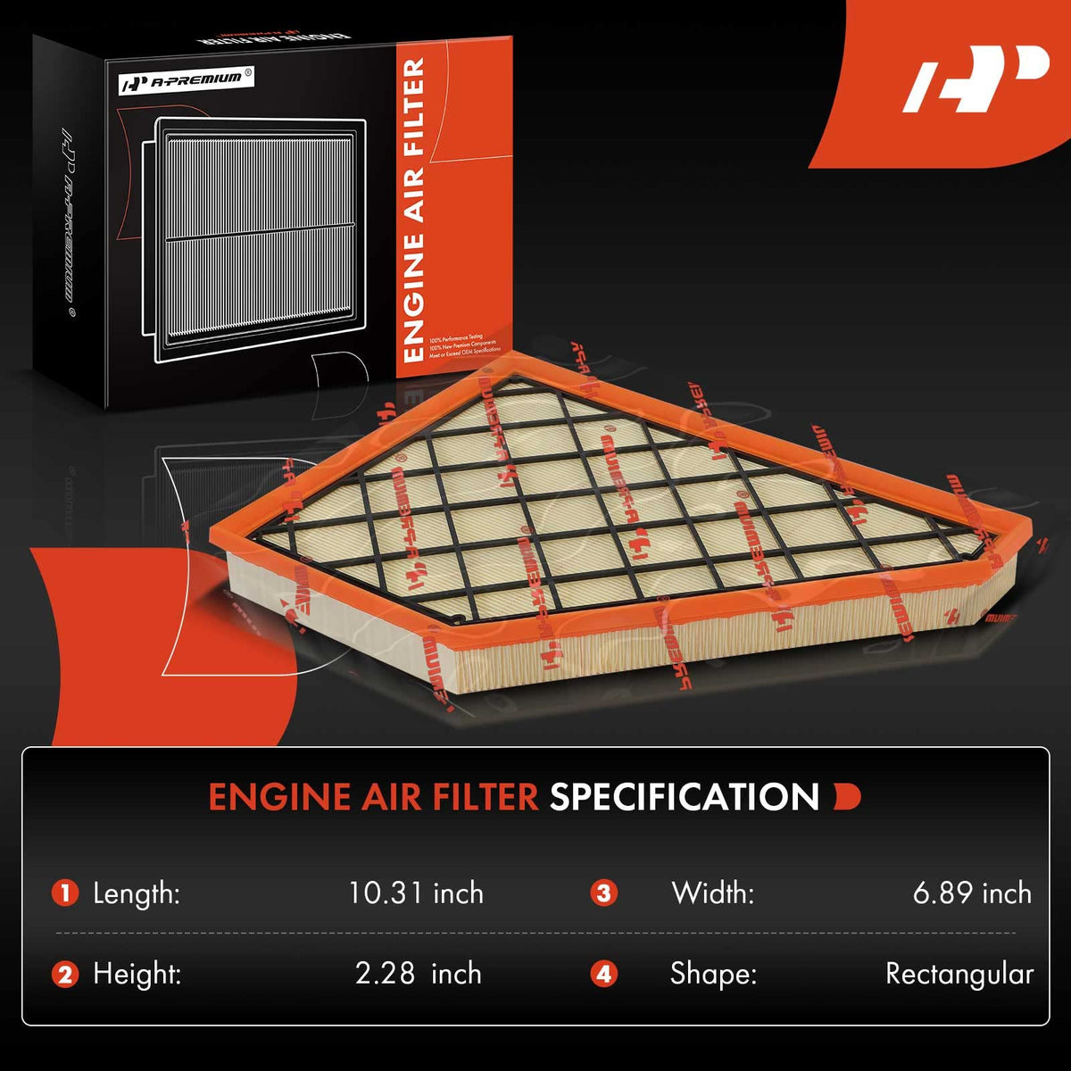Q: What are the dimensions of the A-Premium Front Engine Air Filter?A: The dimensions of the A-Premium Front Engine Air Filter are as follows: Length - 14.09 inches, Width - 10.08 inches, and Height - 1.67 inches. It features an irregular shape.