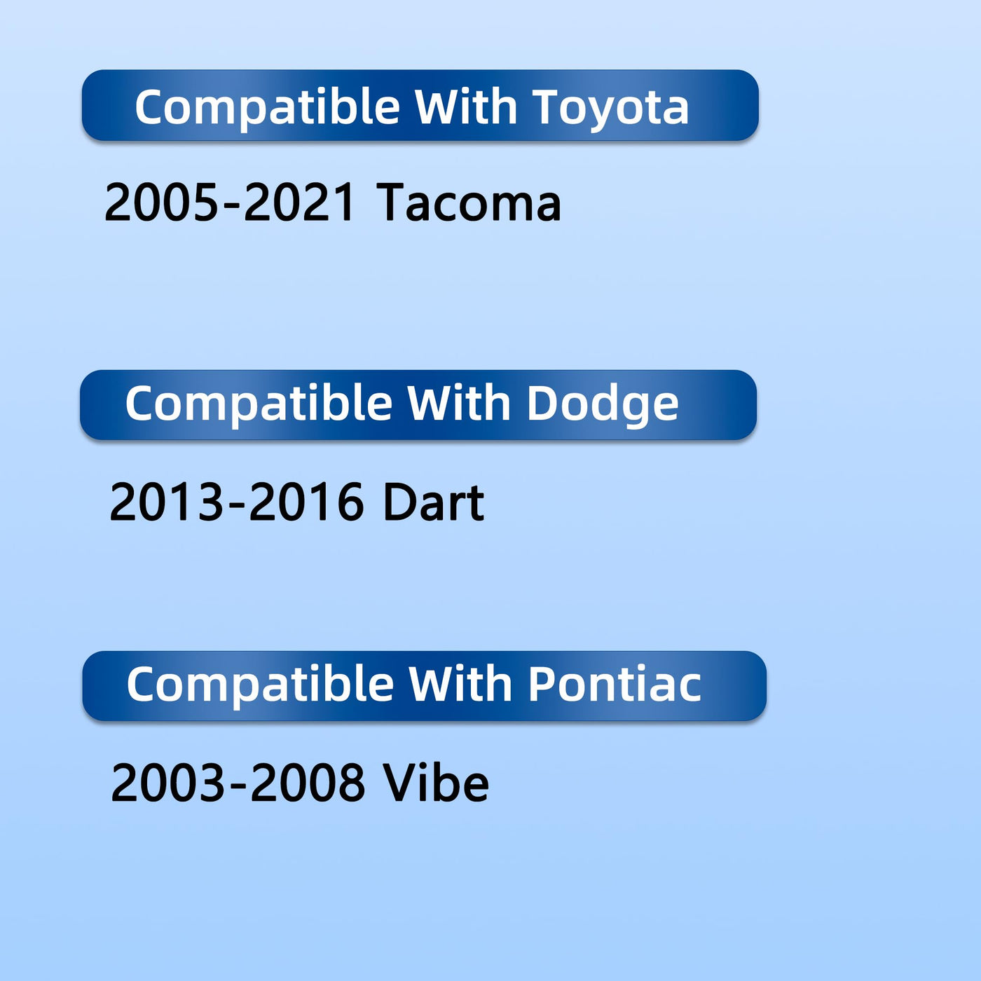 Q: What vehicles are compatible with the CF10374 Cabin Air Filter?A: The CF10374 Cabin Air Filter is compatible with 2005-2021 Toyota Tacoma, 2013-2016 Dodge Dart, and 2003-2008 Pontiac Vibe. Please double-check your vehicle's year, make, and model before purchasing.