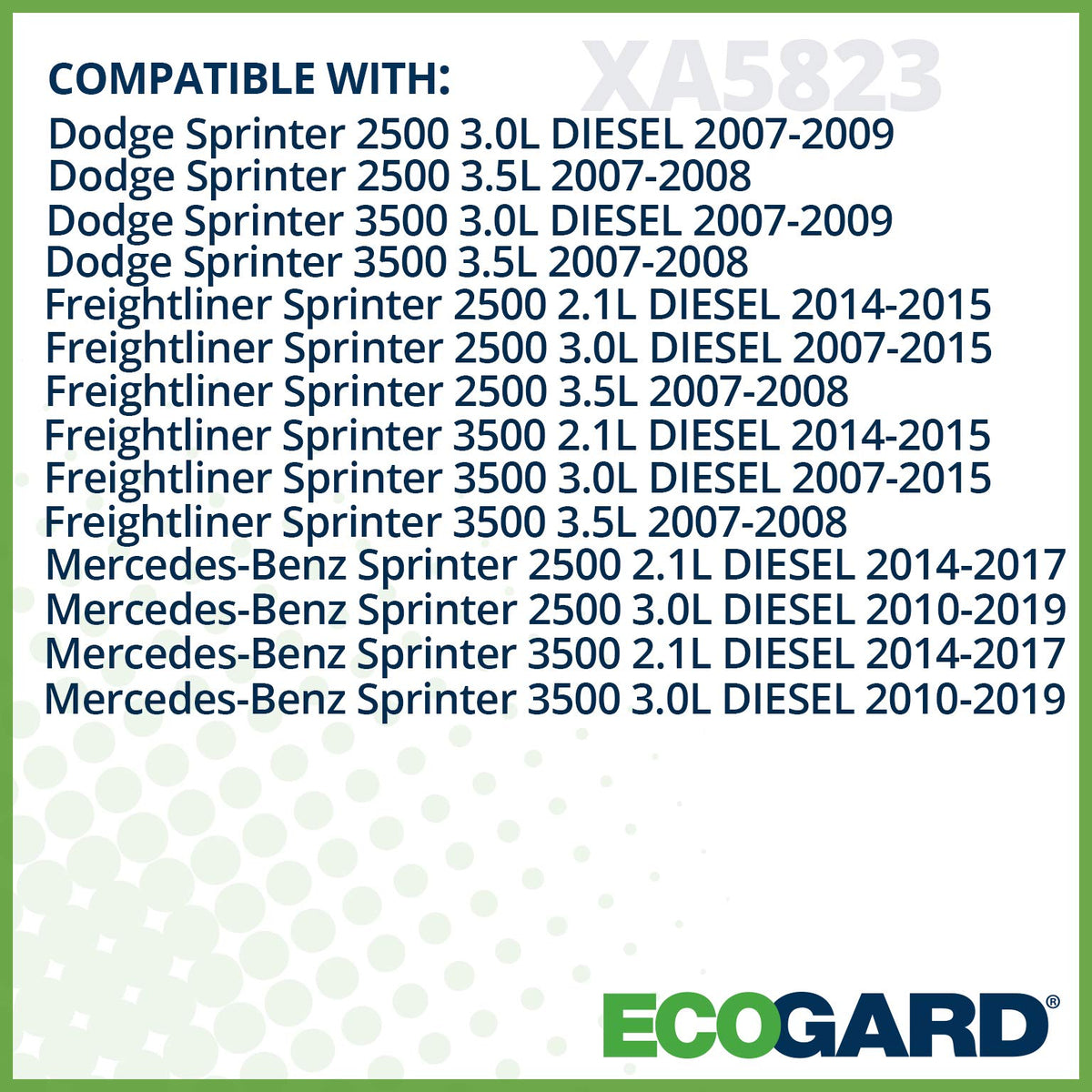 Q: What vehicles are compatible with the ECOGARD XA5823 air filter?A: The ECOGARD XA5823 air filter is compatible with various models including the Mercedes-Benz Sprinter 2500 3.0L DIESEL (2010-2021), Sprinter 3500 3.0L DIESEL (2010-2021), Dodge Sprinter 2500 3.0L DIESEL (2007-2009), and many more. For a full list, please refer to the product description.
