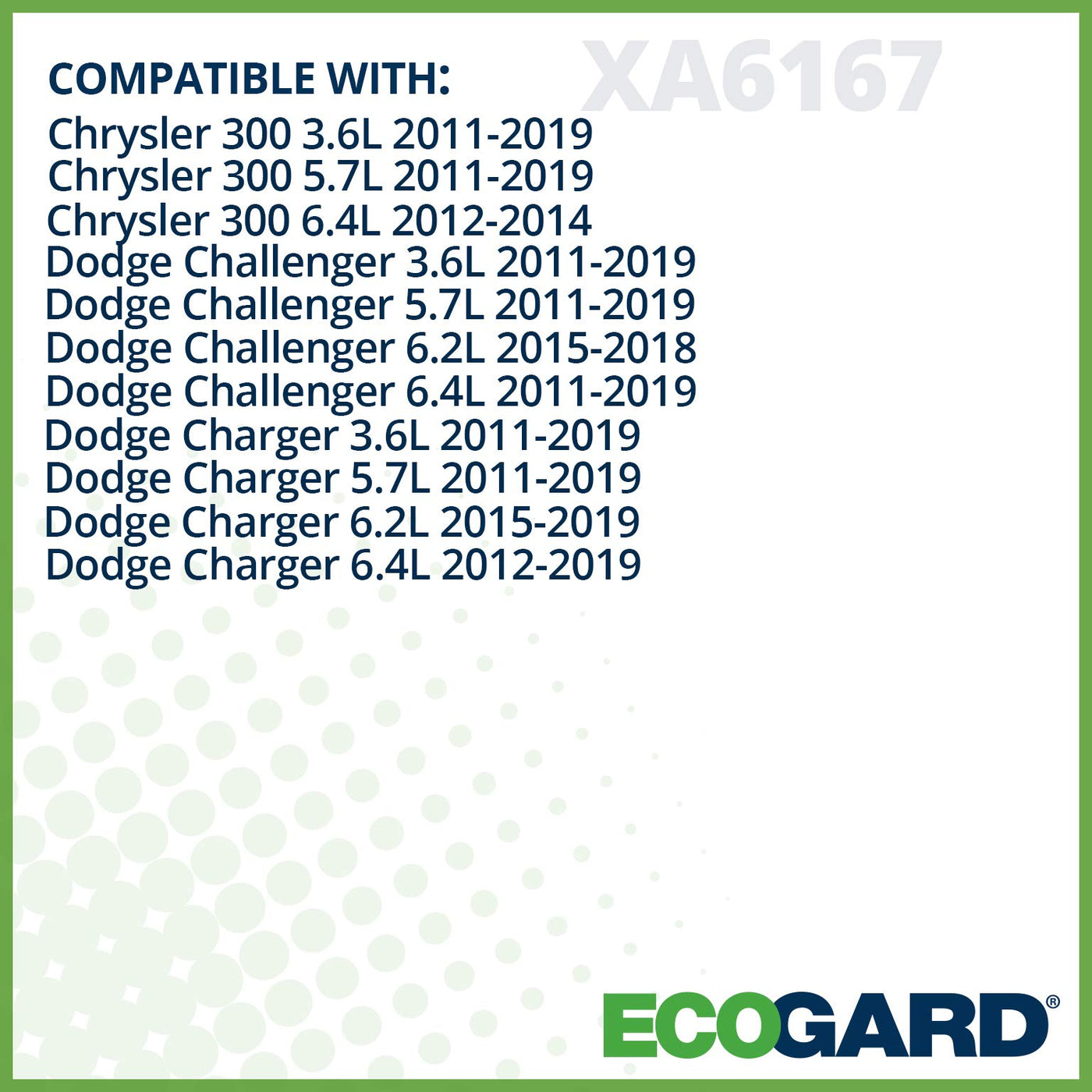 Q: What vehicles are compatible with the ECOGARD XA6167 engine air filter?A: The ECOGARD XA6167 engine air filter is compatible with various models, including Dodge Charger 3.6L (2011-2021), Challenger 3.6L (2011-2021), Charger 5.7L (2011-2021), Challenger 5.7L (2011-2021), and Challenger 6.4L (2011-2021), as well as Chrysler 300 models.