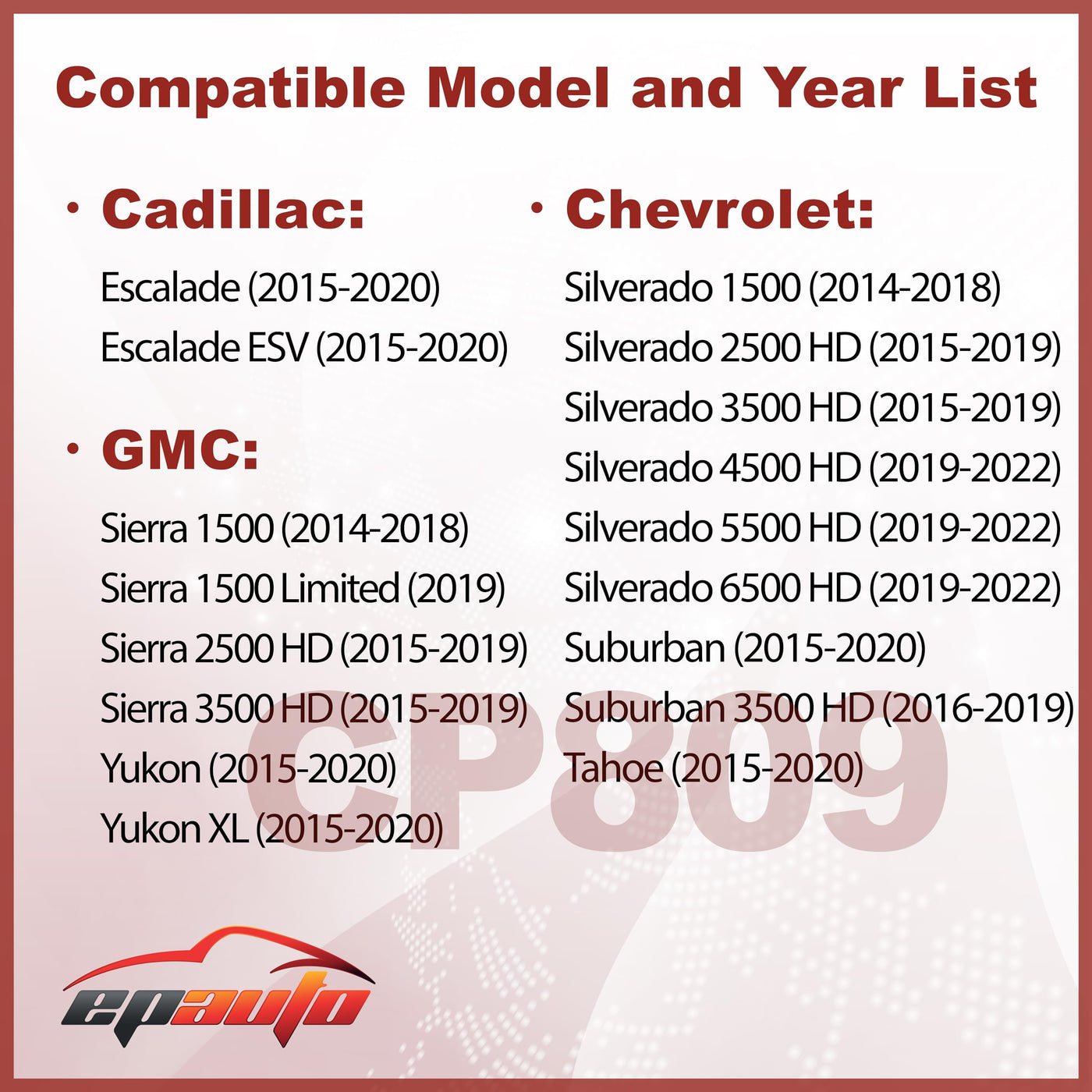 Q: What vehicles are compatible with the EPAuto CP809 Cabin Air Filter?A: The EPAuto CP809 Cabin Air Filter is compatible with various Cadillac, Chevrolet, and GMC models. Specifically, it fits Cadillac Escalade (2015-2020) and Escalade ESV (2015-2020), Chevrolet Silverado 1500 (2014-2018), Silverado 2500 HD (2015-2019), Silverado 3500 HD (2015-2019), Silverado 4500 HD (2019-2022), Silverado 5500 HD (2019-2022), Silverado 6500 HD (2019-2022), Suburban 5.3L Flex (2015-2020), Suburban 3500 HD (2016-2019), Tahoe Flex (2015-2020), GMC Sierra 1500 (2014-2018), Sierra 1500 Limited (2019), Sierra 2500 HD (2015-2019), Sierra 3500 HD (2015-2019), Yukon (2015-2020), and Yukon XL (2015-2020).
