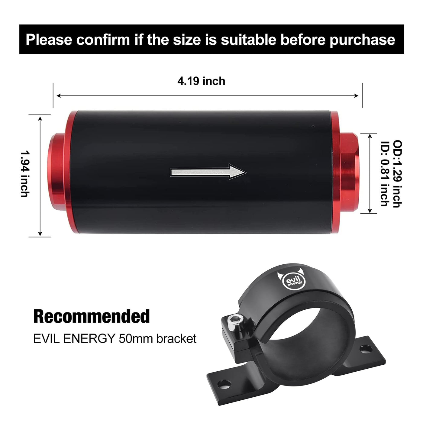 Q: How do I maintain the EVIL ENERGY Inline Fuel Filter?A: The filter features a removable design, allowing for easy cleaning or replacement of the filter element at regular intervals to ensure optimal performance.