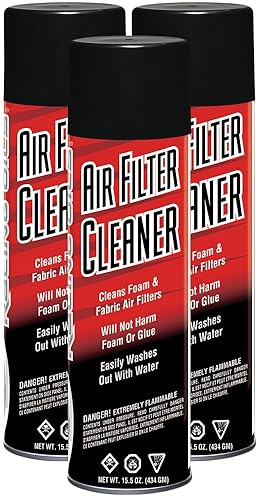 Maxima Air Filter Cleaner is a ready to use, heavy-duty emulsion-type cleaner. Designed to thoroughly clean both foam and fabric air filters without damaging foam cells, paper or glue. Maxima Air Filter Cleaner will remove oil and dirt from air filter elements and easily washes out with water. For use with petroleum based oils. Rated #1 by Dirt Rider magazine. 3-Pack Contains a total of 3, 15.5 Ounce Aerosol Cans.
