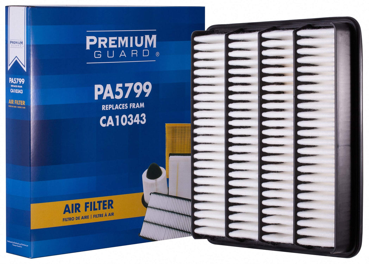Q: How does the Premium Guard Air Filter improve engine performance?A: The Premium Guard Air Filter utilizes high-capacity air filter media that effectively removes 99% of harmful particles from incoming engine air, which enhances overall engine performance and efficiency.