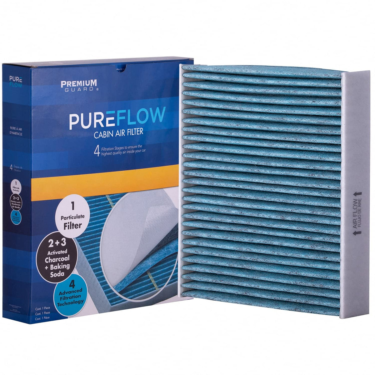 Q: How does the Pureflow Cabin Air Filter improve air quality?A: The Pureflow Cabin Air Filter utilizes advanced filtration technology that blocks 99% of particles such as dust and pollen, ensuring you breathe cleaner air. It features multiple filtration levels, including activated charcoal that captures harmful gases and baking soda to neutralize odors.