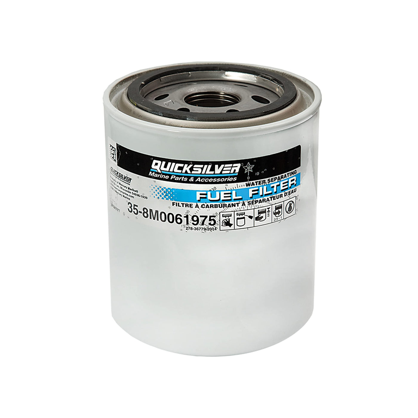 Q: What type of fuel filter is the Quicksilver 8M0061975?A: The Quicksilver 8M0061975 is a water separating fuel filter designed to fit OMC fuel filter spin-on housings.
