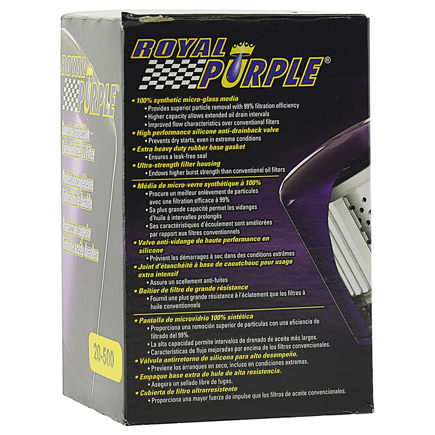 Q: What makes Royal Purple 20-500 Oil Filter stand out from other oil filters?A: The Royal Purple 20-500 Oil Filter is distinguished by its 100% synthetic micro-glass media that offers superior particle removal with 99% filtration efficiency at 25 microns. Its ultra-strength filter housing is designed to withstand higher burst strength than conventional filters, ensuring durability and reliability.