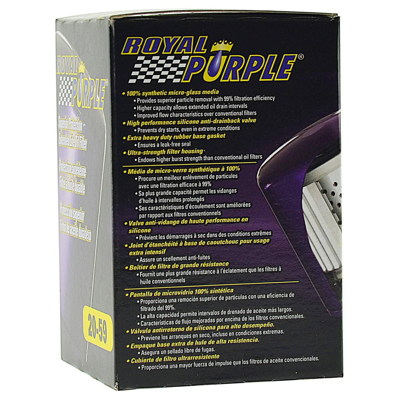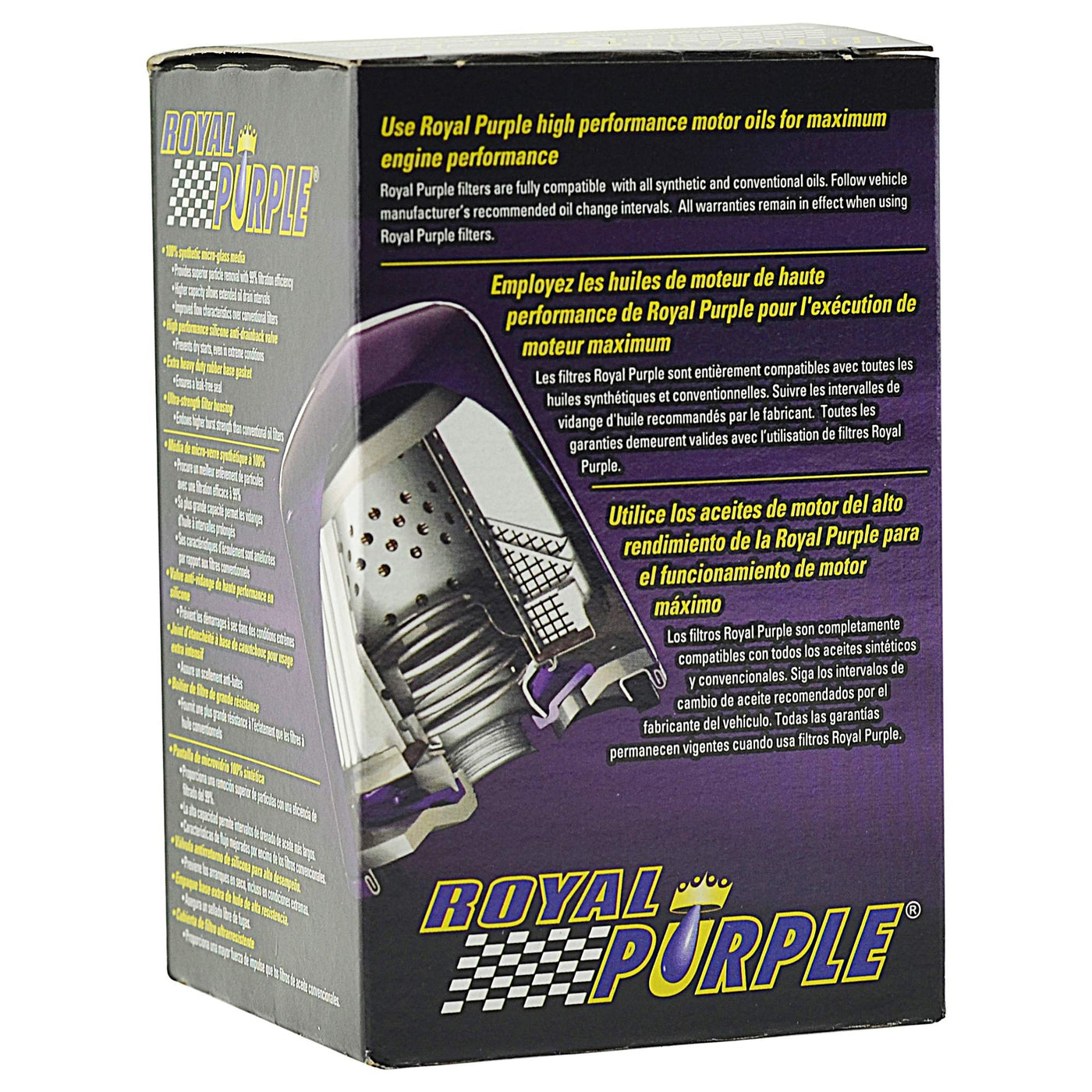 Royal Purple Oil Filter Features 100 Percentage Synthetic Micro-Glass Media For Superior Particle Removal With 99 Percentage Filtration Efficiency At 25 Microns. This Product Is Designed With A High-Performance Silicone Anti-Drain Back Valve That Prevents Dry Starts, Even In Extreme Conditions And An Extra Heavy-Duty Rubber Base Gasket That Ensures A Leak-Free Seal. The Royal Purple Oil Filter Also Provides An Ultra-Strength Filter Housing That Can Endure Higher Burst Strength Than Conventional Filters. Royal Purple Filters Are Fully Compatible With All Synthetic And Conventional Oils, Provide Superior Particle Removal, High-Performance, Optimized Flow Characteristics For Maximum Performance, And Longer Filter Life.