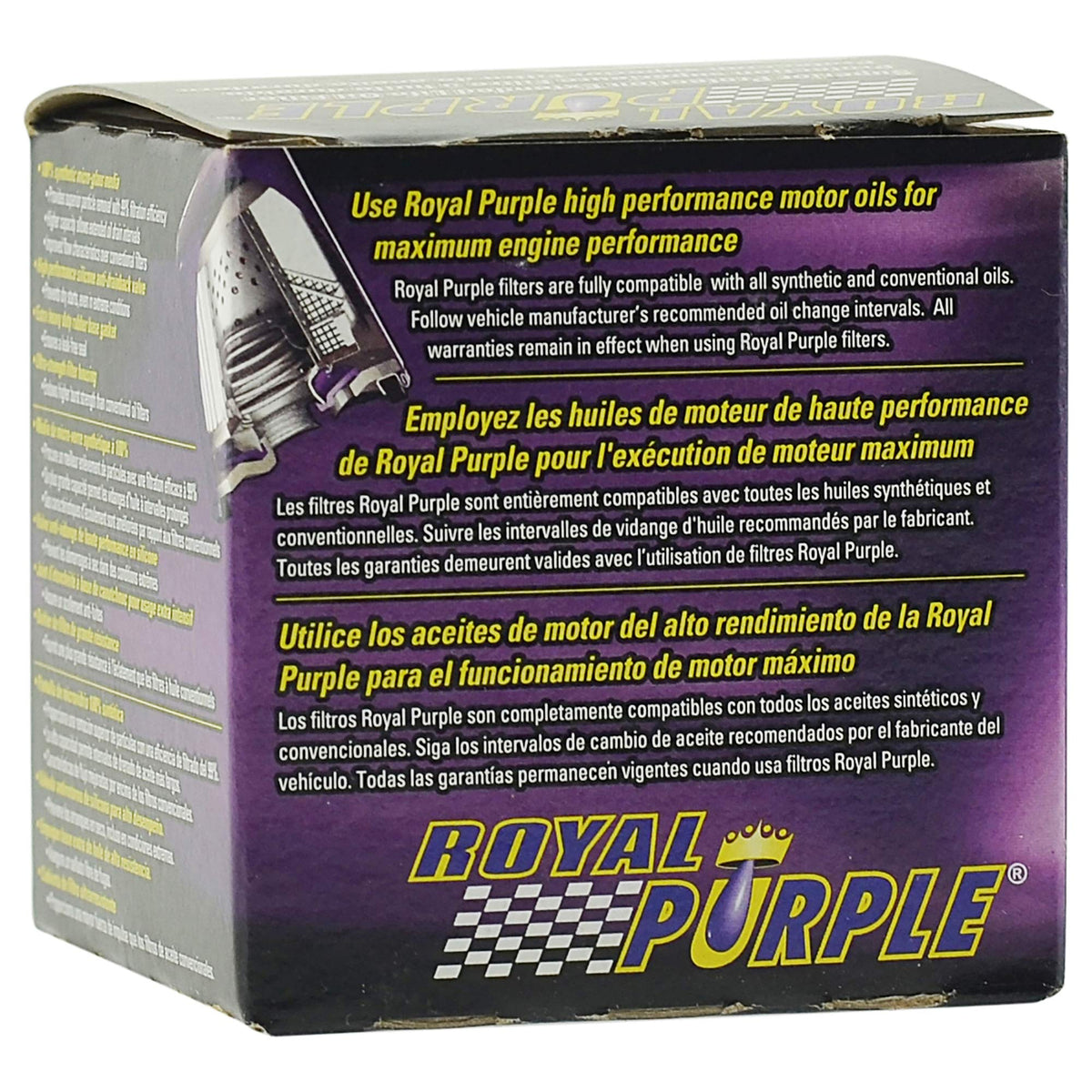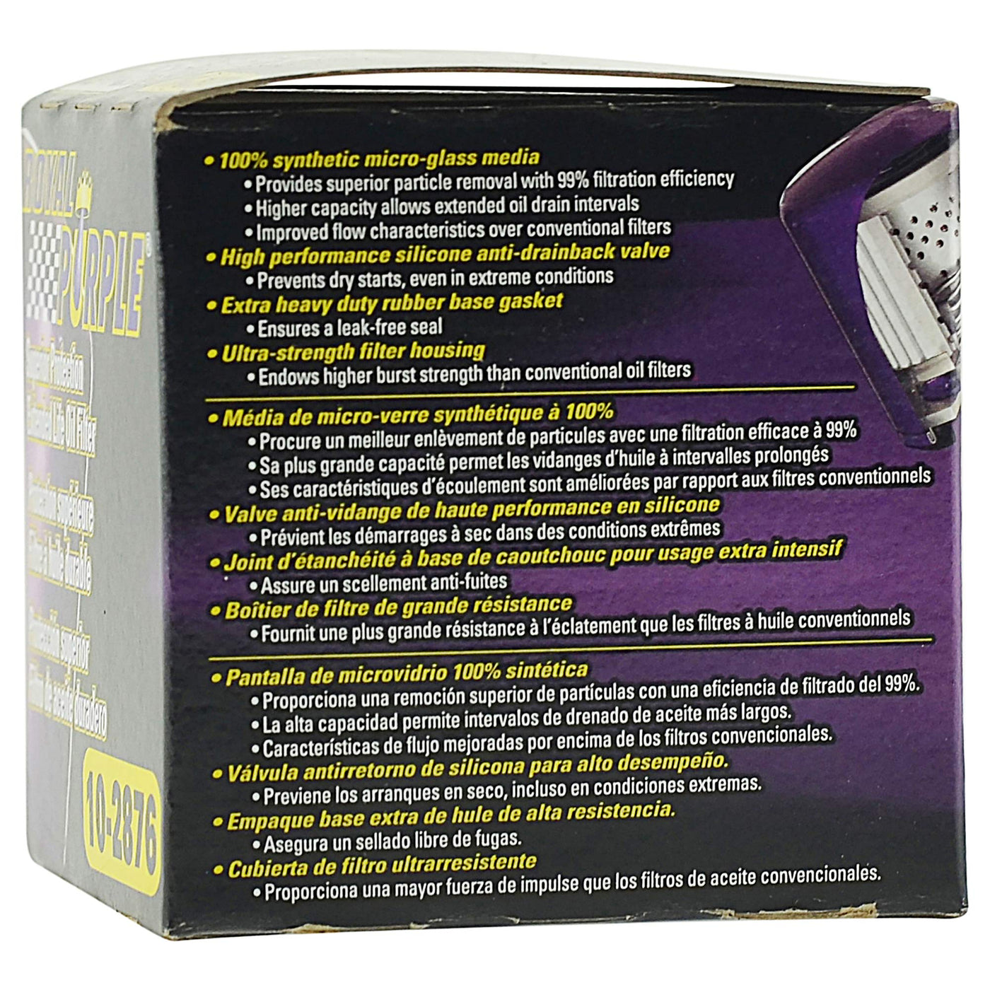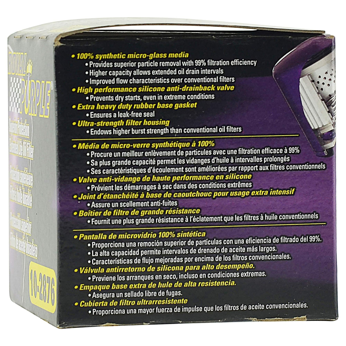 Q: What makes the Royal Purple oil filter different from standard filters?A: The Royal Purple Extended Life Oil Filter uses all-synthetic micro-glass media, providing 99% filtration efficiency at 25 microns or larger. This superior filtration helps to protect your engine from harmful contaminants more effectively than standard filters.