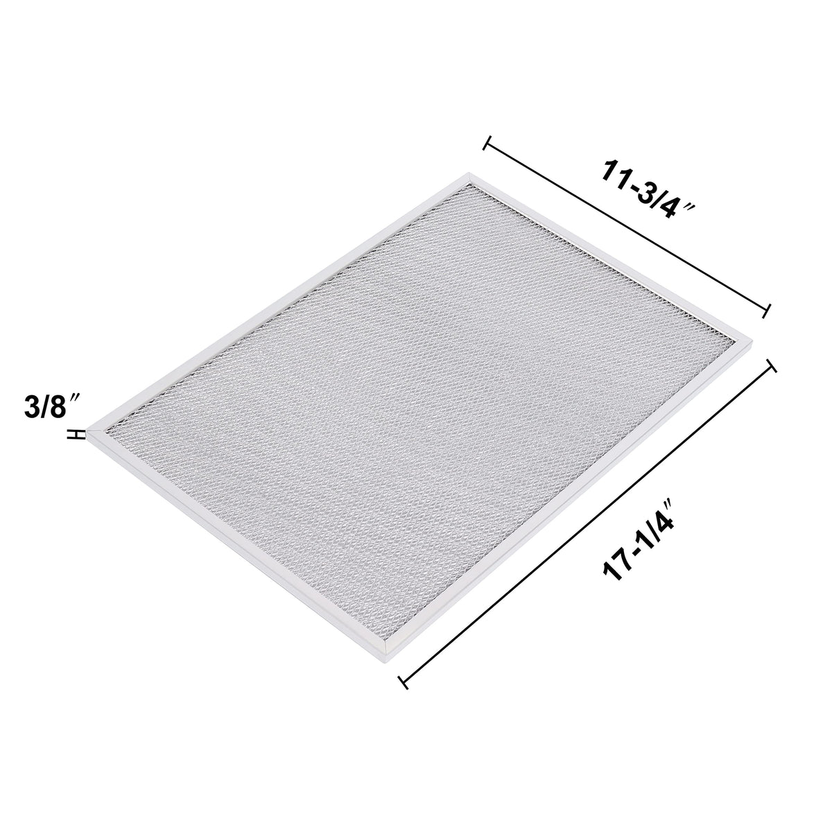Q: What are the dimensions of the Wadoy BPS1FA36 range hood filter?A: The Wadoy BPS1FA36 range hood filter measures 11-3/4" x 17-1/4" x 3/8".