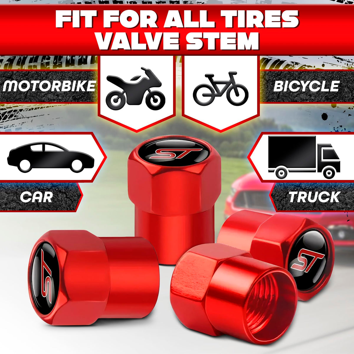 Fathers Day gifts for dad gifts for husband fathers day gifts for husband gifts for men Enhance your vehicle's appearance and protect your tires with this set of 4 ST Logo Metal Tire Valve Stem Caps. Made from high-quality zinc alloy, these durable caps resist corrosion, rust, and fading over time. The universal fit ensures compatibility with cars, trucks, motorcycles, and bicycles, offering a versatile upgrade for any vehicle. The stylish ST logo adds a sleek touch to your wheels, elevating their overall look. These metal valve stem caps provide a complete seal, effectively blocking water, dust, and sand from entering the tire valve stems. This helps maintain optimal tire pressure and extends tire life, making them an essential car accessory. Installation is quick and easy-just screw the caps onto your valve stems with no tools required. Whether you need black valve stem caps, red valve stem caps, or tire pressure caps, these tire stem caps 4-pack combines functionality with style. Perfect as tire valve covers or valve caps for added tire protection and a polished finish.