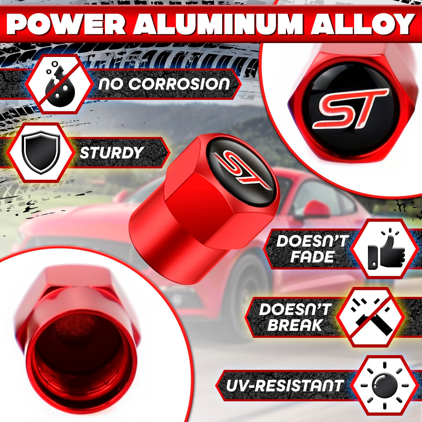 4Pcs St Logo Metal Tire Valve Stem Caps With Rubber O-Rings - Fits Ford St Models | Durable Metal Alloy, Corrosion-Resistant, Un