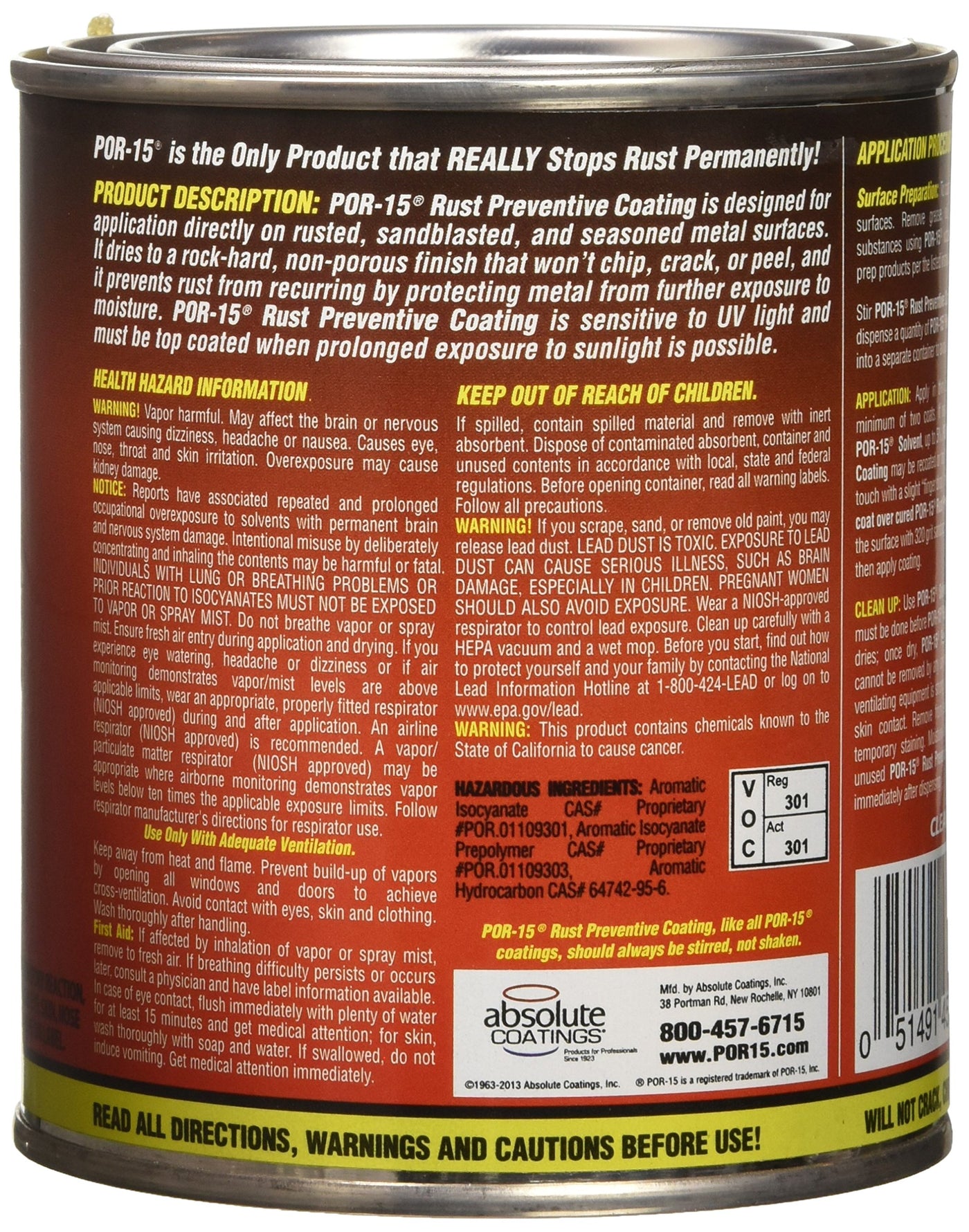 Q: What is the recommended application process for POR-15 Rust Preventive Coating?A: For best results, clean the surface with POR-15 Cleaner Degreaser, then prepare it with POR-15 Metal Prep to etch and neutralize rust. Stir the coating thoroughly without shaking, and apply thin coats, allowing at least 2 to 5 hours to dry before applying additional coats.