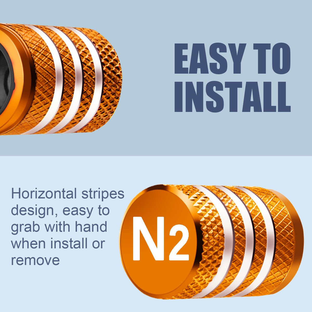 ANTI-SEIZE DESIGN: The tire valve stem caps come with metal shell and plastic insert, which will prevent the valve stem from corrosion, esspecially in wet/cold area. | WIDE COMPATIBILITY: Our tire air caps are compatible with all American standard schrader valve stem. Include cars, SUVs, trucks, RVs, bicycles, bikes, and other motor vehicles. | EASY to INSTALL: With the simple and smooth horizontal stripes design, DECURCAR valve stem caps are easily hand tightened or took off. | LEAK-PROOF: Built-in One-piece sealing ring inside the plastic liner with leak-proof function. Prevent damage to the car due to tire leaks. | FASHION APPEARANCE: DECURCAR valve stem covers are made of durable light-weight aluminum alloy with N2 nitrogen emblem laser-etched. These are stylish and fashion tire stem caps and when you have nitrogen in your tires it's a great alternative to the plastic green caps.
