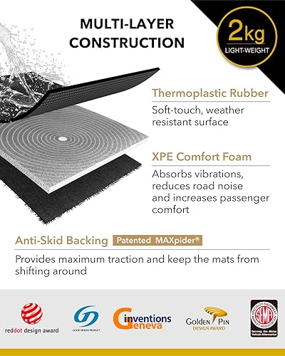 Q: What materials are used in the 3D MAXpider Floor Liners?A: The 3D MAXpider Floor Liners are constructed with a multi-layer design including Thermoplastic Rubber for waterproof protection, an XPE Foam Middle Layer for comfort, and a patented Anti-Skid Backing to prevent slipping.
