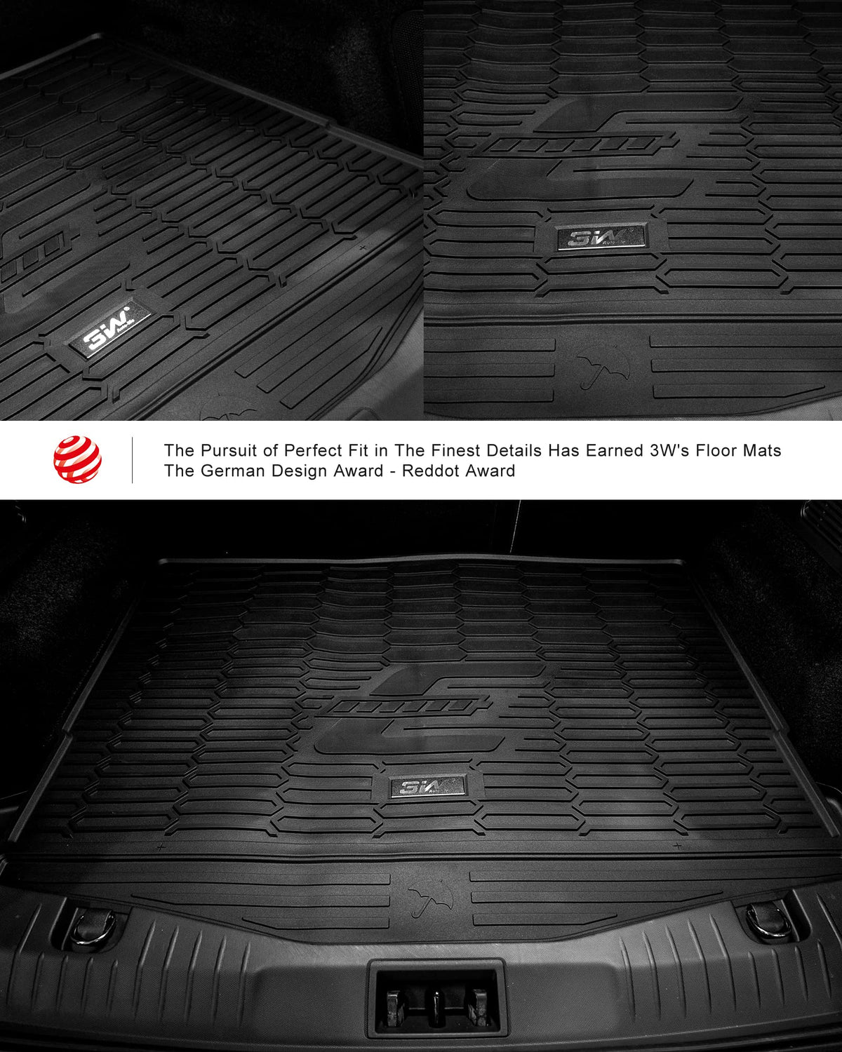 3W Auto Accessory Inc: 3W stands for Wonderful, Worldwide, Worthy. We are a company manufacturing floor liners/trunk mat with 25 years of history. We are one of the first companies in this filed to use TPE and injection molding to manufacture floor liners. The traditional floor liners are made by compression molding, which does not allow for many details, causing the floor liners/cargo liner to be rigid and stiff. 3W floor liners/cargo mat are designed with different patterns fitting the style of different models of cars. TPE material: 3W car mats are made from Thermoplastic Elastomers, which shows advantages of both rubbery materials and plastic materials thus having more strength, resilience, durability and elasticity. It has more outstanding thermal properties and material stability when exposed to an extreme temperature. 3W trunk mat has no odor even in extremely hot weather with all car windows closed, and can stay resilient in extremely cold weather. Some babys pacifiers are made from the same material. This design won the 2017 Red Dot award in Germany. Custom fit and easy to clean: Each 3W cargo liner is custom fit. We scan the interior of each car and computer design the pattern incorporating key elements of the vehicle, gives the trunk mat a customized look and feel, will match the interior of your car perfectly. The back of 52W floor liners are designed with air pockets to effectively absorb the noise from the chassis. In addition, every car liner has a raised containment walls protecting your vehicle from all kinds of mess. You can finish cleaning up the cargo liners within few minutes.