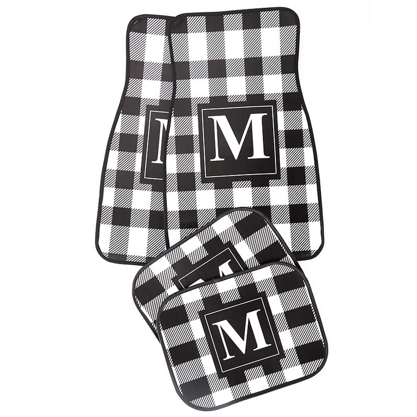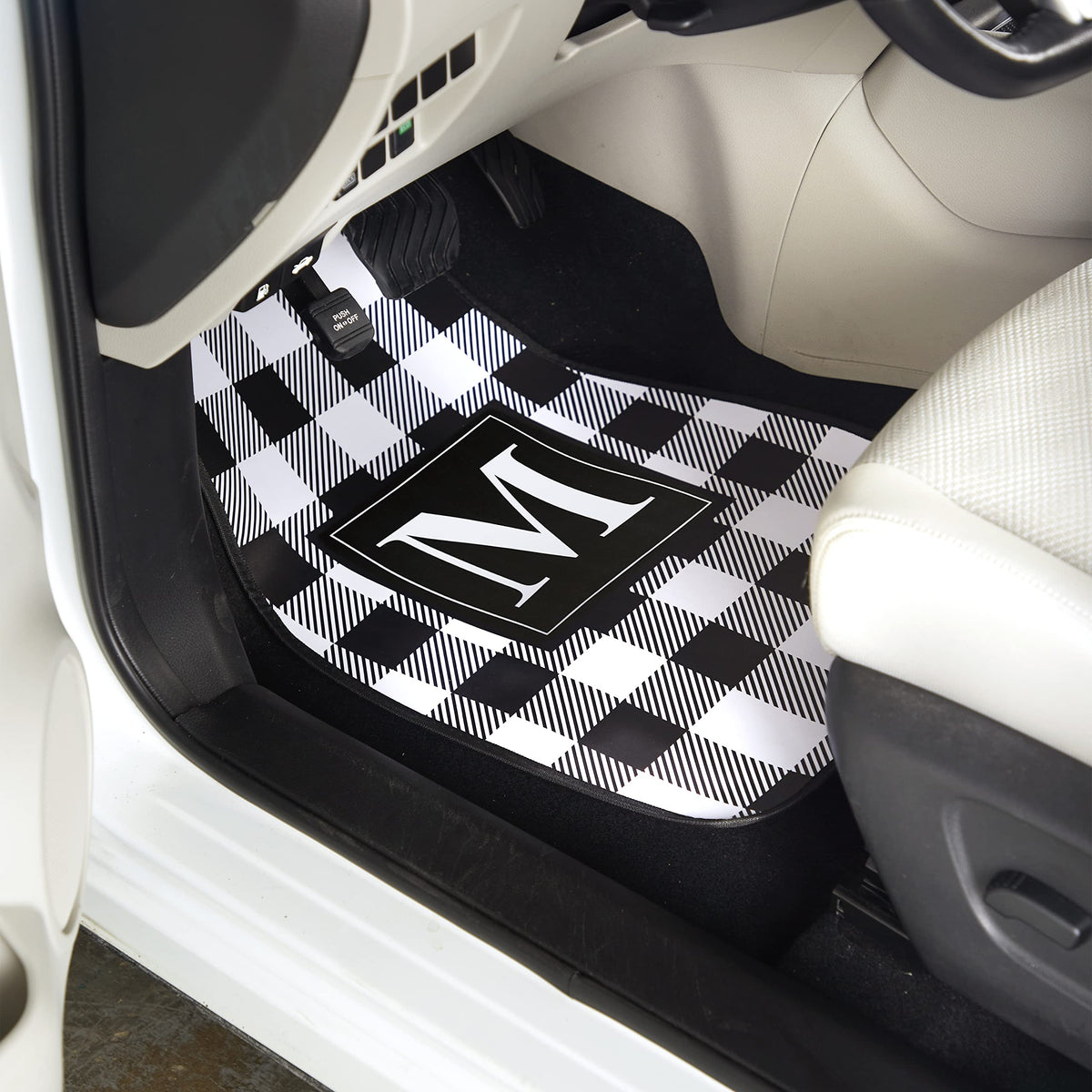Personalize your vehicle and protect its floors with our 4-Pc. Monogram Plaid Car Mat Set. Each mat features a black and white buffalo plaid pattern. Also available without a monogram. One size fits most cars, SUVs and trucks. Nonslip rubber backing.