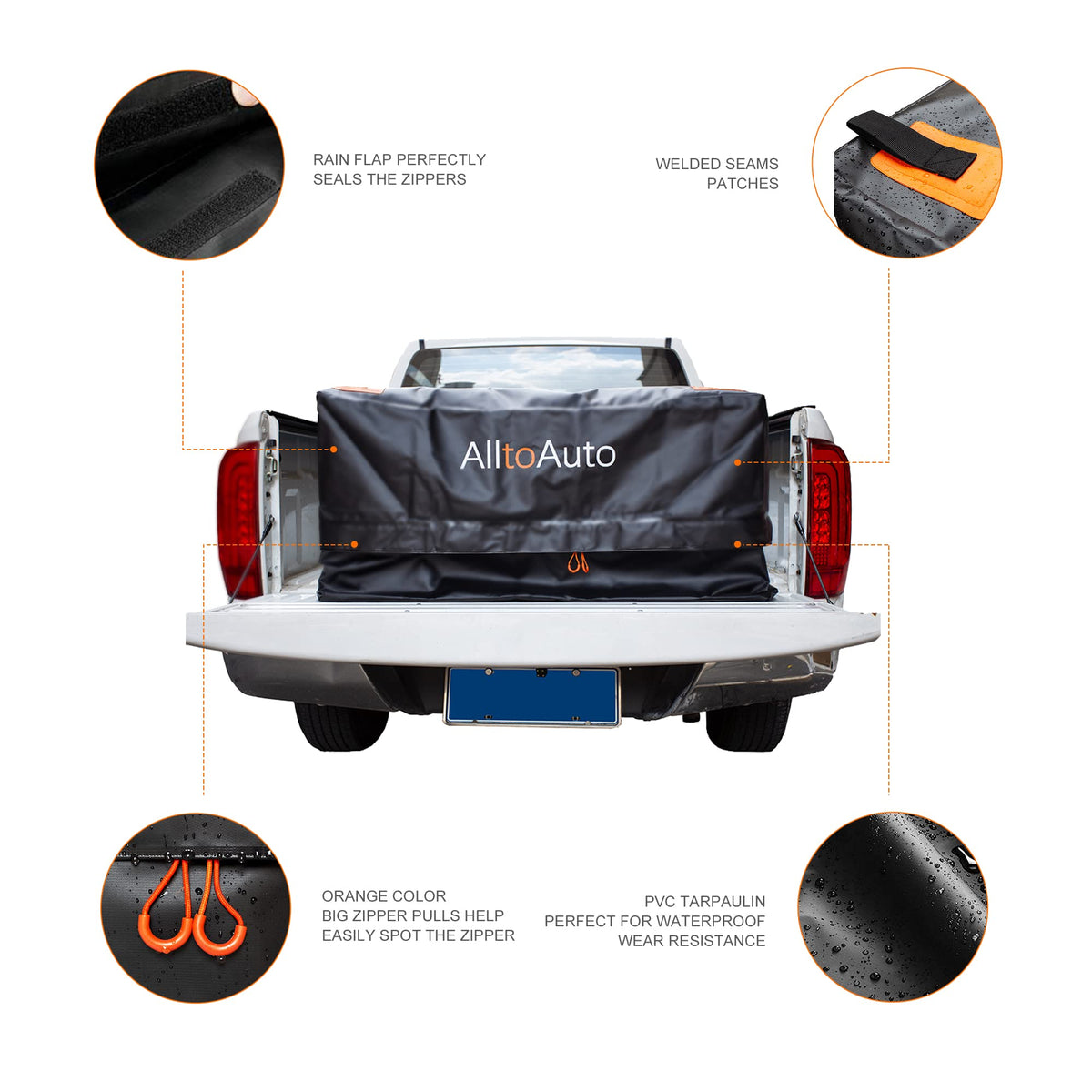 Alltoauto Truck Bed Cargo Bag With Cargo Net, 100% Waterproof 600D Heavy Duty, Fits Any Truck Size(51X40X22 ) 26 Cubic Feet,&Nbsp Simple And Convenient For Installation Truck Cargo Bag Carriers:&Nbsp 100% Waterproof And Heavy-Duty&Nbsp Dual-Seal Hot-Press Gluing Technology&Nbsp Safety: Reflecting Marking On The Back And Top Heavy Duty Zippers And Strong Buckles Whatas Included (Full Accessories):&Nbsp Truck Bag Carrier Cargo Net 4 Straps With Hooks Product Details: Product Dimension: 50 A 40 A 22 Inches Package Size: 138 A 11 A 79 Inches Material: 600D Pvc Technique: Hot-Press Gluing Capacity: 26 Cubic Feet Net Weight: 838 Pounds Gross Weight: 1367 Pounds Weatherproof: Yes