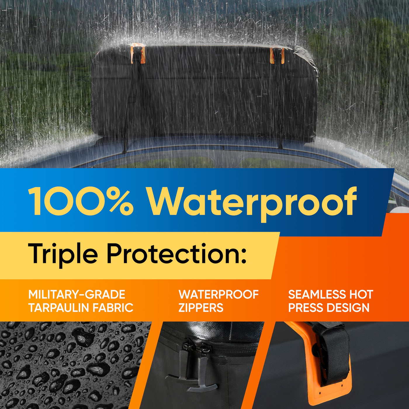 ALL SET TO GO - Pack for your next adventure with a car roof cargo carrier from BAGMATE! Your large, 15 cubic ft. roof cargo bag keeps everything you need securely out of the way, so you can relax and hit the road! | CAR TOP CARRIER FOR ALL CONDITIONS - Bad weather? No worries. Your car roof storage bag is 100% waterproof and keeps your things safe through snow, sun, or sleet because of its coated tarpaulin and zippers! | SAFE AND SECURE - Enjoy the assurance of a roof top cargo carrier that puts safety first. Unlike other roof bags, your car roof luggage carrier includes 4 door hooks that don
