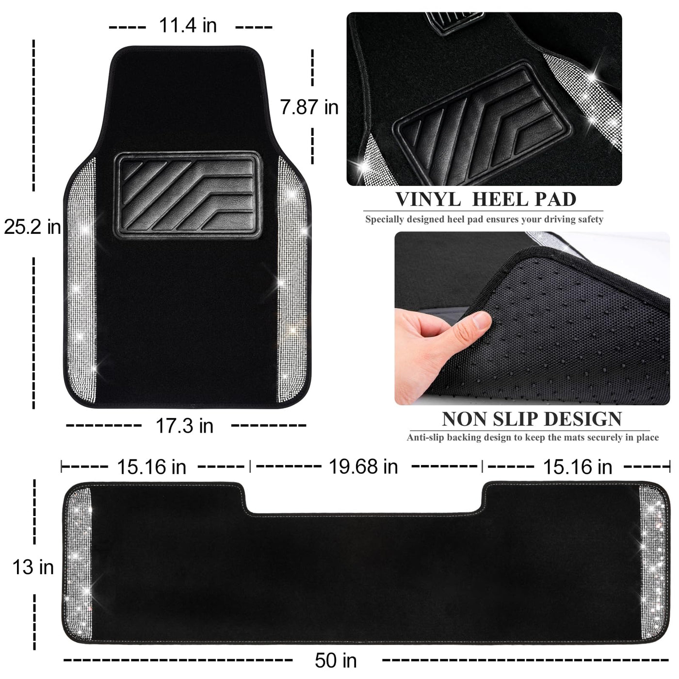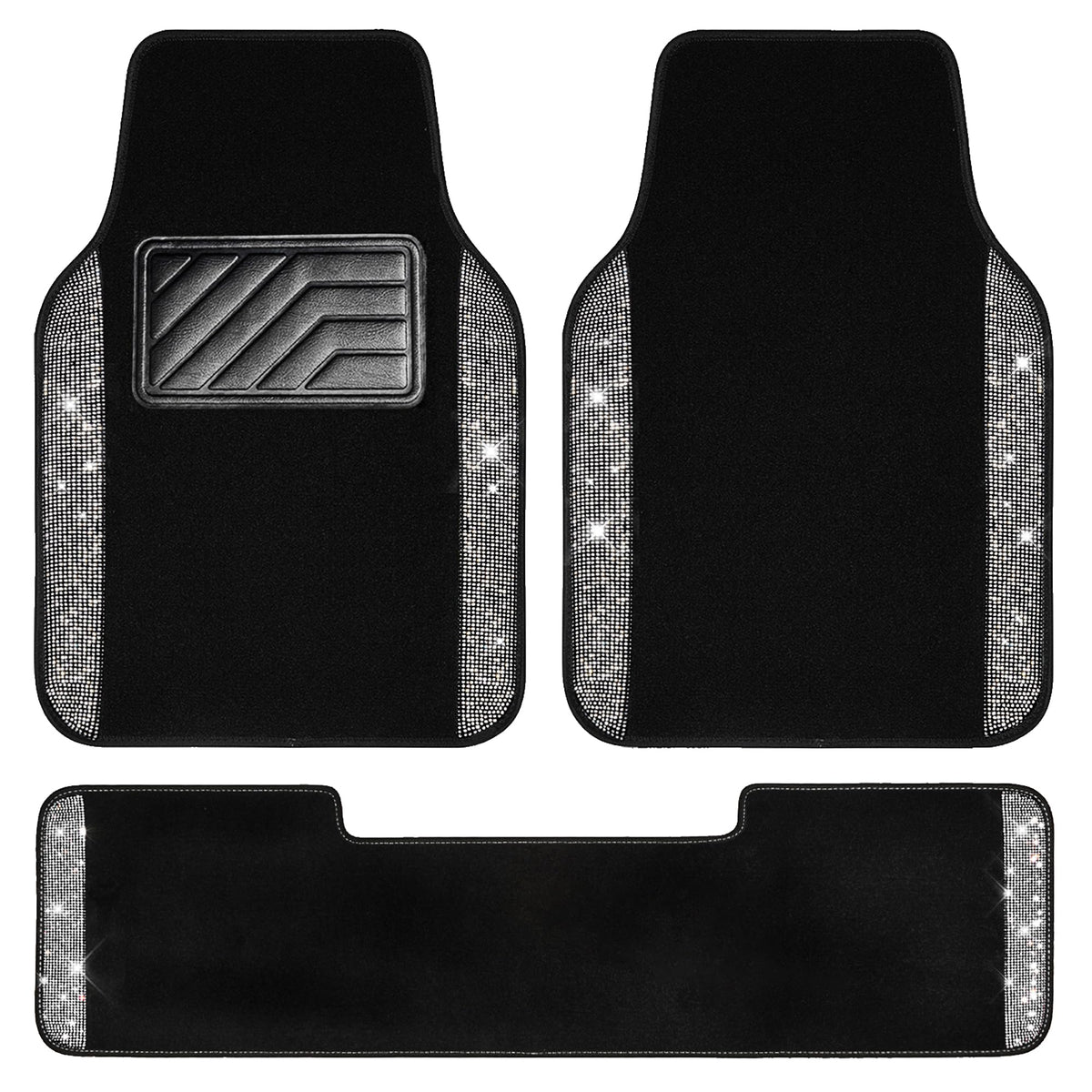 ???BLING DIAMOND FLOOR MAT?Premium carpet with pretty Rhinestones silver diamond and black carpet made. Refresh and protect your car in just seconds. Shield your car upholstery from stains, spills and everyday wear & tear with these waterproof floor mat | ???HIGH QUALITY MATERIAL?The black silver car mats Made of high quality sparkly Diamond and PVC brake pad. Shiny diamonds don't fall out. Glitter in the sun and bring a nice vibe to the interior of your car. The PVC brake pad has anti-skid effect and durable, your feet will not be tired when you put your feet on the anti-skid brake pad. | ???ANTI-SLIP DESIGN?Heavy nibbed Backing on the back of the mat to keep the mats securely in your car. The waterproof Oxford allows you to simply spray each mat clean of dirt, mud, grit, and grime restoring the mats luster and shine with each wash. | ???SIZE AND COLOR?Universal Size fits most vehicles: car, sedan, SUVs, truck, vans. Front Mats: 17.3 W x 25.2 L, Rear Mats 13 W x 50 L. Package Includes (3pcs) : Front Mat*2, Rear Side Mat*1. There are sparkling diamonds in different colors on the side of the mat, those diamonds make your car beautiful and shiny. Perfect cute gift for women and girls. | ???EXCELLENT SERVICE?Our Brand CAR PASS. We offer high quality Car Accessories to you. We put product quality and your trust first. Do our best to provide you with quality service.
