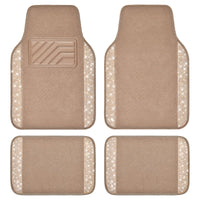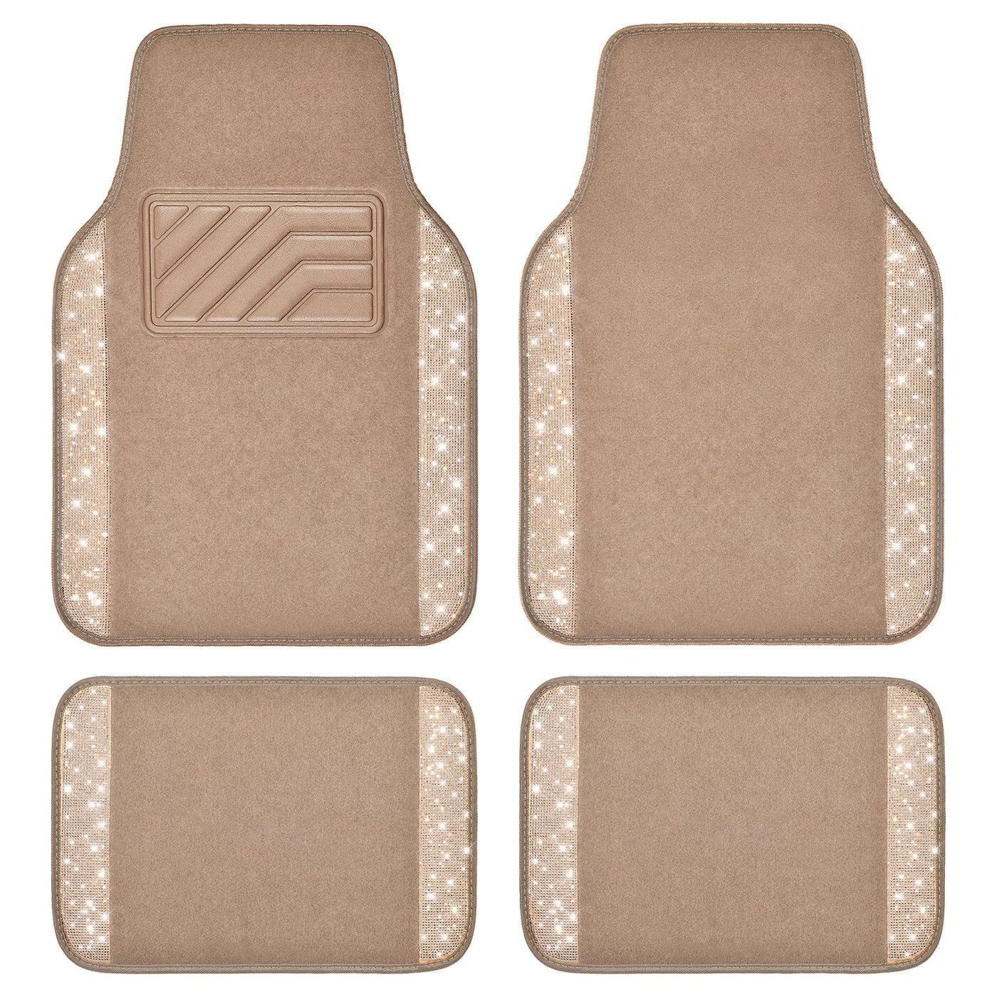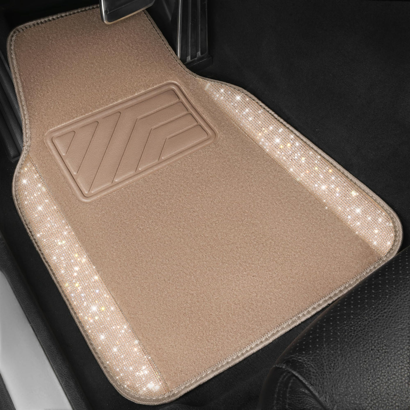 BLING DIAMOND FLOOR MAT - Premium carpet with pretty rhinestones silver diamond and beige carpet made. Refresh and protect your car in just seconds. Shield your car upholstery from stains, spills and everyday wear & tear with these waterproof floor mat | HIGH QUALITY MATERIAL - The beige car mats Made of high quality sparkly diamond and PVC brake pad. Shiny diamonds don't fall out. Glitter in the sun and bring a nice vibe to the interior of your car. The PVC brake pad has anti-skid effect and durable, your feet will not be tired when you put your feet on the anti-skid brake pad. | ANTI-SLIP DESIGN - Heavy nibbed backing on the back of the mat to keep the mats securely in your car. The waterproof Oxford allows you to simply spray each mat clean of dirt, mud, grit, and grime restoring the mats luster and shine with each wash. | SIZE AND COLOR - Universal size fits most vehicles: car, sedan, SUVs, truck, vans. Front Mats: 17.3 W x 25.2 L, Rear Mats 11.8 W x 17.3 L. Package Includes (4pcs) : Front Mat*2, Rear Side Mat*2. There are sparkling diamonds in different colors on the side of the mat, those diamonds make your car beautiful and shiny. Perfect cute gift for women and girls. | EXCELLENT SERVICE - Our Brand CAR PASS. We offer high quality Car Accessories to you. We put product quality and your trust first. Do our best to provide you with quality service.
