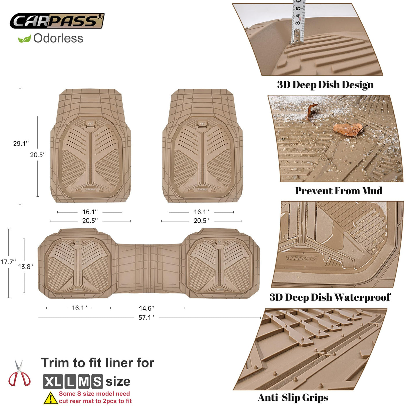Car Pass Heavy Duty Rubber Car Mats, Deep Dish Car Floor Mats Full Set, Universal All Weather Automotive Mats 3 Pieces Trim To F