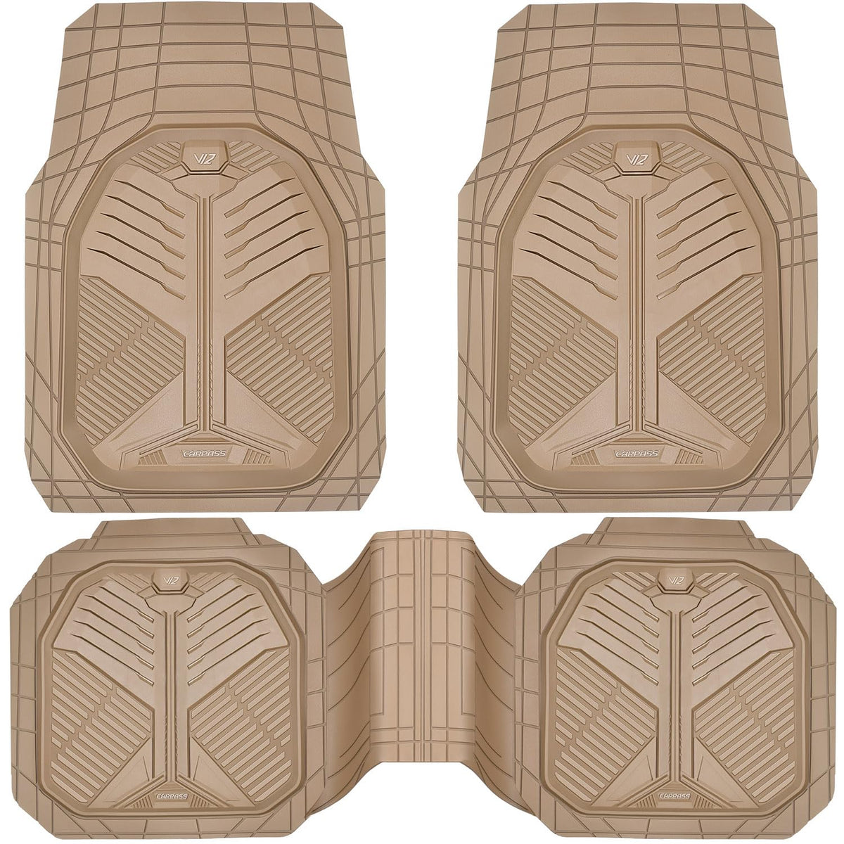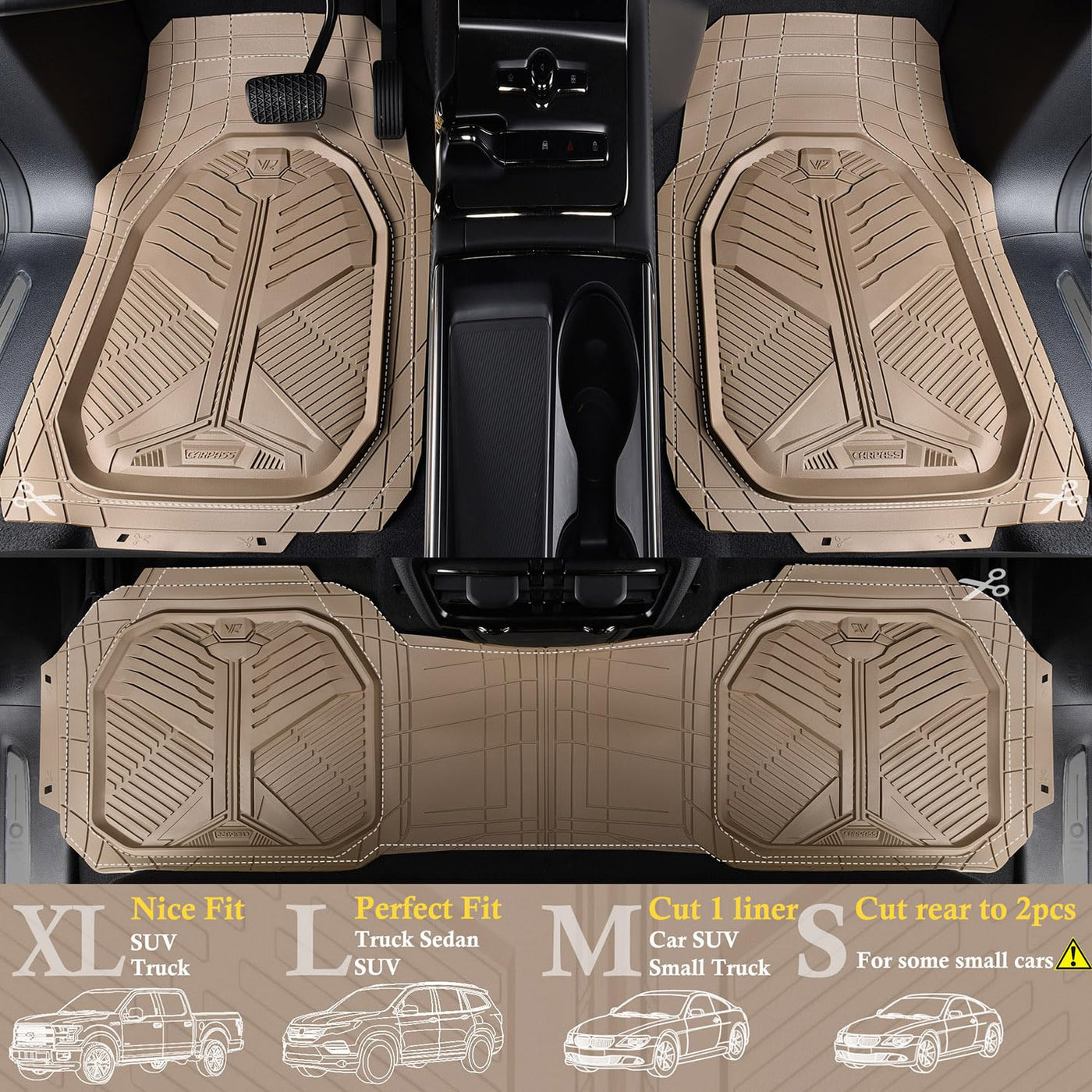 Heavy Duty Car Floor Mats, All Weather Car Mats Full Set, Universal Automotive Mats 3 Pieces Trim to Fit for Sedans SUVs Trucks, Deep Dish Waterproof Anti-slip Rubber Floor Mats, Beige