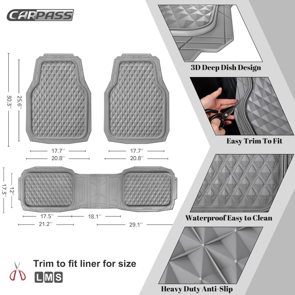 CAR PASS Heavy Duty Rubber Car Mats, Gray Deep Dish All-Weather Car Floor Mat Full Set Durable Anti-Slip 3D Rhombus Waterproof T