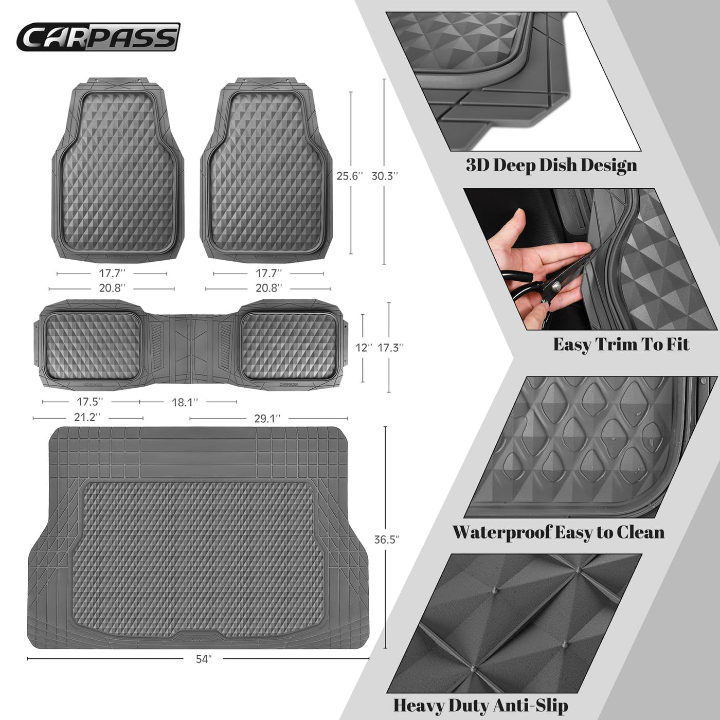 Car Pass Heavy Duty Rubber Gray Car Floor Mats & Cargo Liners, Deep Dish All-Weather Trunk Mats Durable Anti-Slip 3D Rhombus Wat