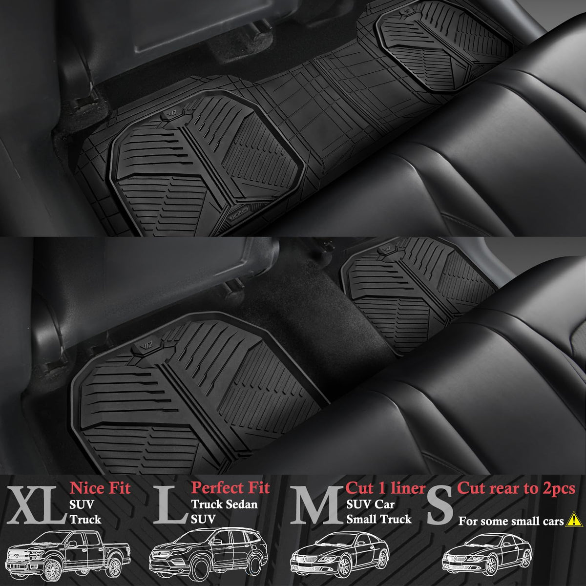 Product Features The heavy-duty mat is made from a durable rubber polymer and a ridged design that holds water, mud, and sand. No matter what season it is, these all-weather mats are engineered to stay flexible. Fast, easy installation in most cars, trucks, and SUVs, it can also be trimmed with a pair of scissors to provide the perfect custom fit. This rear car mat with nail bottom will keep them securely in place. 1. Maximum protections for your car's floor against rain, snow, mud, dirt, debris, food, coffee, mess, spills, stains. 2. Simply cut through the lines until you find the perfect fit! 3. Specially designed anti-slip back surface and clips catches the ground carpet of your car. 4. Durable and long lasting and will withstand normal wear and tear.