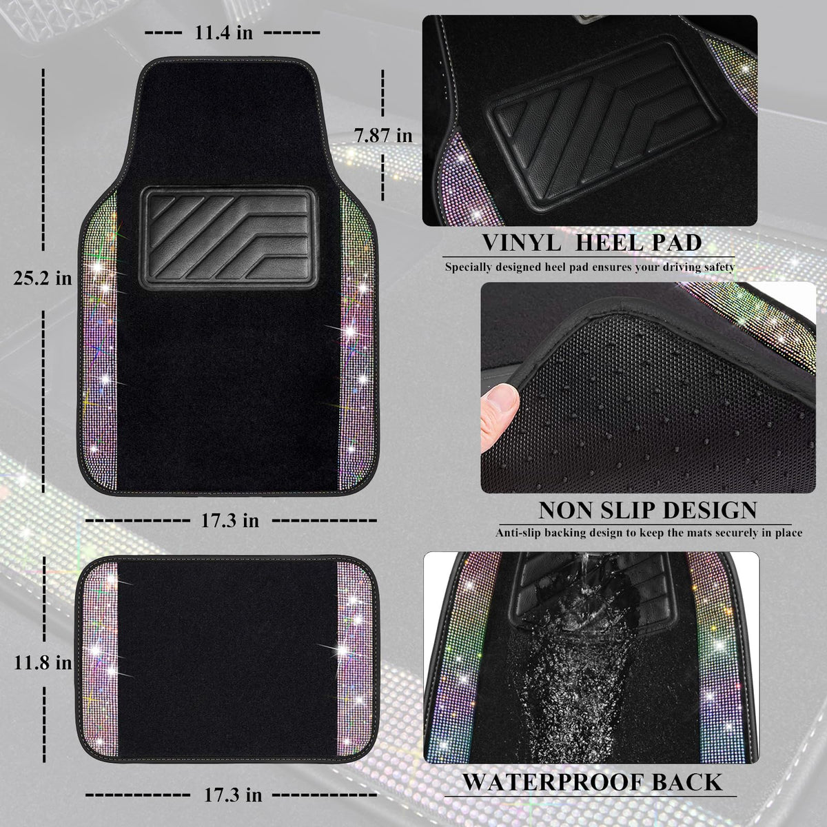 Q: What are the dimensions of the CAR PASS Iridescent Bling Rhinestones Floor Mats?A: The CAR PASS Iridescent Bling Floor Mats come in a universal size that fits most vehicles. The front mats measure 17.3 inches wide by 25.2 inches long, while the rear mats measure 11.8 inches wide by 17.3 inches long.