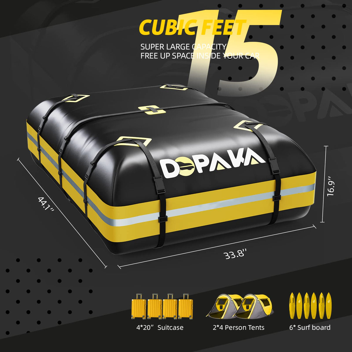 Q: How much storage space does the carrier provide?A: The carrier offers a generous storage capacity of 15 cubic feet, which is sufficient to hold up to 6 suitcases along with other outdoor travel supplies like sleeping bags and tents, making it ideal for family road trips.