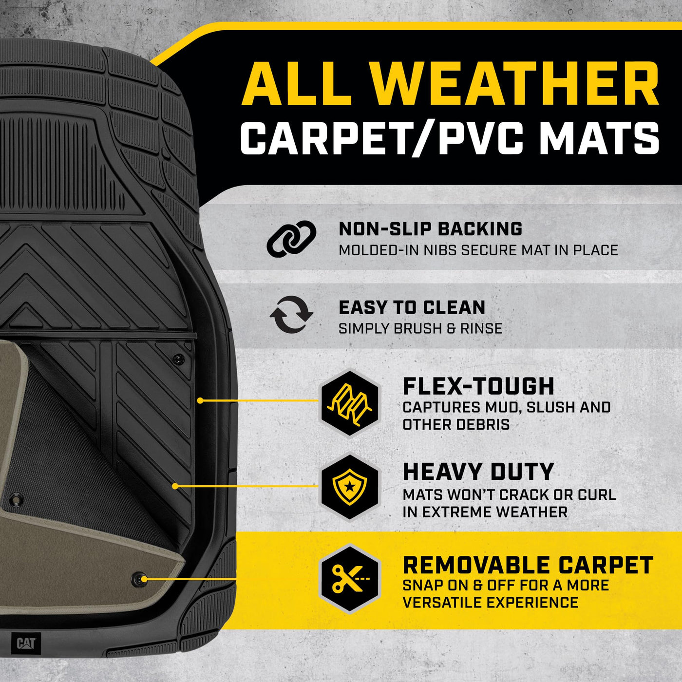 CAT Detachable Deep Dish Car Floor Mats with Removable Carpet Liner - Heavy-Duty All-Weather ProtectionUpgrade your vehicles interior with the versatile and durable CAT Detachable Deep Dish Car Floor Mats. Designed for SUVs, trucks, and sedans, these all-weather floor liners offer superior protection against dirt, mud, spills, and debris while delivering a customizable, comfortable driving experience. Featuring a unique removable carpet liner, these mats combine heavy-duty rubber construction with the soft, cushioned feel of carpet for added comfort and convenience.The deep-dish design traps liquids, debris, and mud, preventing messes from spreading throughout your vehicle. The removable carpet liners provide an additional layer of comfort and are easy to detach for cleaning. Simply rinse the rubber mat and wash the carpet liner separately for effortless maintenance.Designed with a universal trim-to-fit system, these mats ensure a snug, tailored fit for a variety of vehicles. The non-slip backing keeps the mats securely in place, enhancing safety while driving. Built to handle tough weather conditions and everyday use, the mats deliver long-lasting durability and functionality.Whether youre braving harsh weather, tackling messy jobs, or looking for a stylish interior upgrade, the CAT Detachable Deep Dish Floor Mats offer a perfect blend of protection, comfort, and practicality. Ideal for drivers seeking reliable all-weather mats with easy-clean convenience, this set is the ultimate solution for maintaining a clean and well-protected vehicle interior.