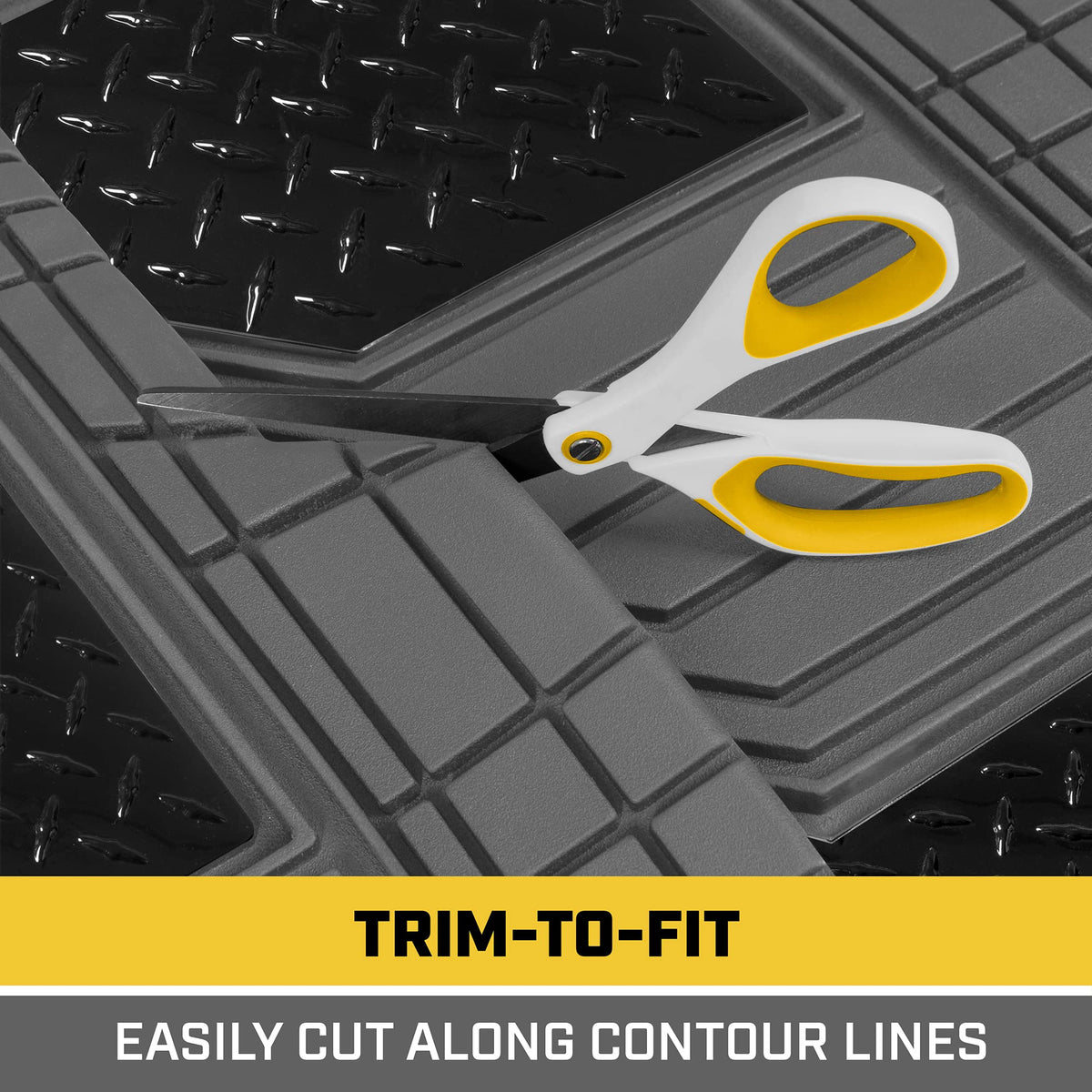 BDK CAT Heavy Duty All-Weather Tough Rubber Car Floor Mats with Metallic DesignProtect and enhance your vehicles interior with the BDK CAT Heavy Duty All-Weather Tough Rubber Car Floor Mats. Perfect for cars, trucks, SUVs, vans, and sedans, this 4-piece set includes front and rear floor mats along with a universal trim-to-fit trunk cargo mat liner for complete all-weather protection. Designed to handle mud, dirt, spills, and everyday wear, these durable rubber mats safeguard your vehicles floors while adding a sleek metallic design for a modern touch.Constructed from high-quality, heavy-duty rubber, these mats are engineered to provide lasting durability under the toughest conditions. Their deep grooves and textured surface trap dirt and debris, preventing messes from spreading and making cleanup a breeze. The anti-slip backing keeps the mats securely in place during sharp turns and sudden stops, offering both safety and convenience. With a customizable trim-to-fit design, these mats can be tailored to perfectly fit your vehicle, ensuring maximum coverage and protection.Designed for practicality and style, these mats are easy to clean-simply remove, rinse, and reinstall for a fresh, clean look. The addition of the universal cargo mat liner offers extra coverage for your trunk, protecting it from heavy loads, spills, and dirt. Whether youre dealing with harsh weather conditions or everyday messes, the BDK CAT Heavy Duty Rubber Floor Mats deliver reliable performance and an upgraded interior look. Ideal for those seeking all-weather, trim-to-fit car mats that combine durability, style, and protection, this set is a must-have for any vehicle.